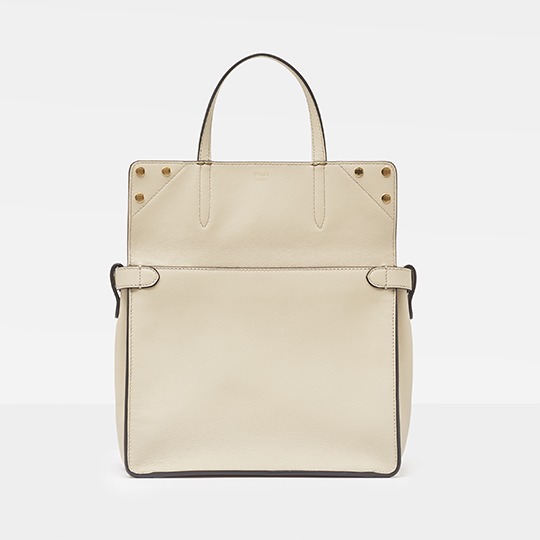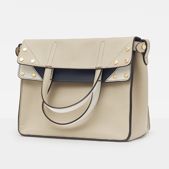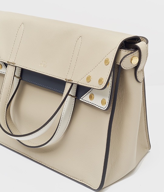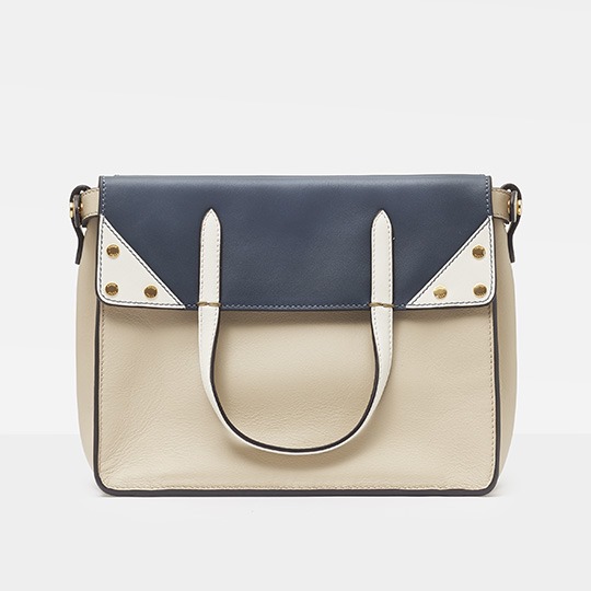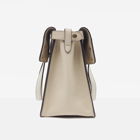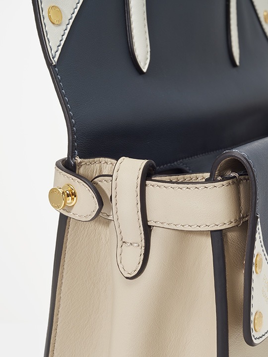 The biggest highlight of the Flip handbag is that it can be switched into multiple styles . The prototype of the bag is a streamlined tote bag , and the contrasting flap and double handle structure on the side give it instant transformation properties. The flaps and handles on both sides fold and hang naturally, and can be held in the hand as a clutch . The beige body of the bag contrasts with the navy blue flap, and the white handles and triangular stitching have a brightening effect. This is the most casual way to carry it, suitable for when there is no heavy object in the bag.