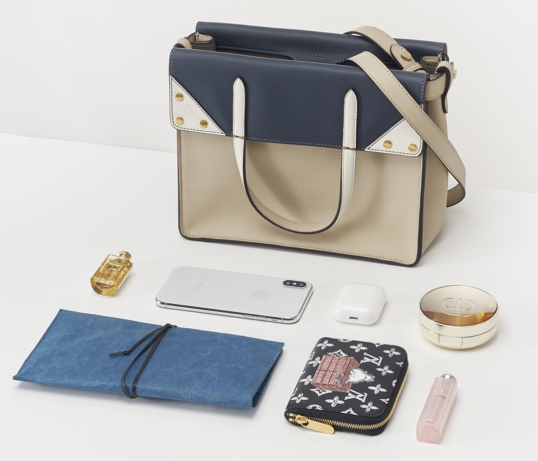 We packed a long passport holder, a coin purse, an iPhone X, a box of powder, a lipstick, a bottle of perfume and a pair of Airpods in it, which took up about half of the bag's space.