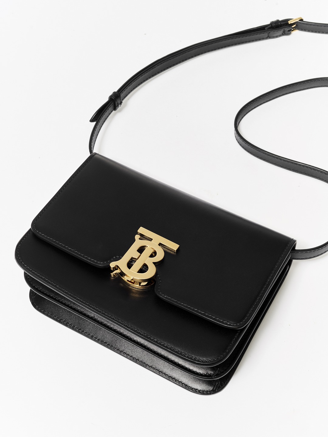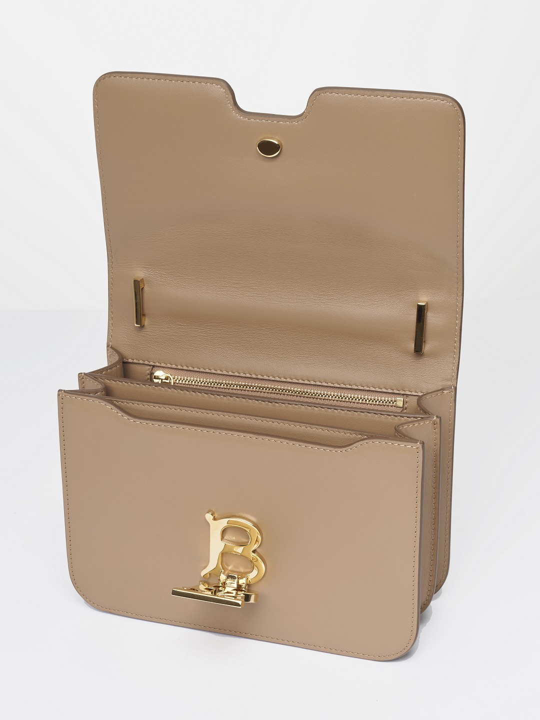 The buckle adopts a double-layer structure, and the complete TB logo is fixed on the outside of the bag cover. After opening, the flap can be opened to reveal the magnetic buckle with the letter B on the inside.