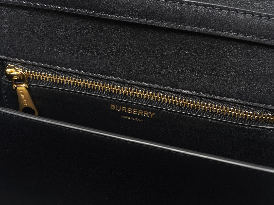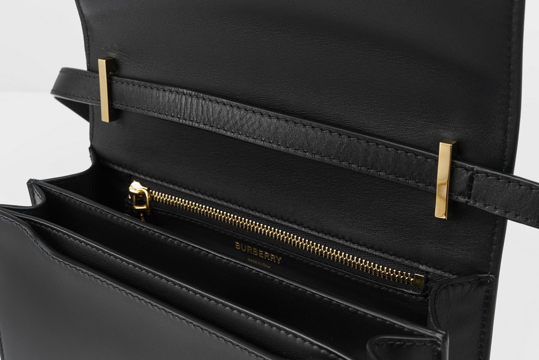 The lining of the bag is soft lambskin, which not only reduces the weight of the bag, but also protects important items such as the mobile phone screen from scratches. The words BURBERRY MADE IN ITALY are hot-stamped below the zipper. The interior is designed with double compartments, with a zippered flat pocket on the back and a small compartment on the front for storing personal items such as cards and keys, or putting your phone in it for easy access. The actual capacity of the bag is much larger than it looks. We used it to carry a short wallet, an iPhone X, a bottle of perfume, a lip gloss, a pack of tissues, a bottle of eye drops and a pair of Airpods without affecting the appearance of the bag at all.