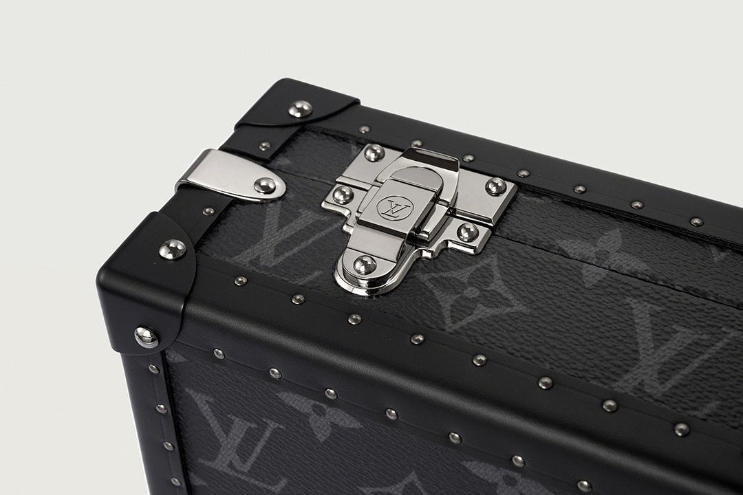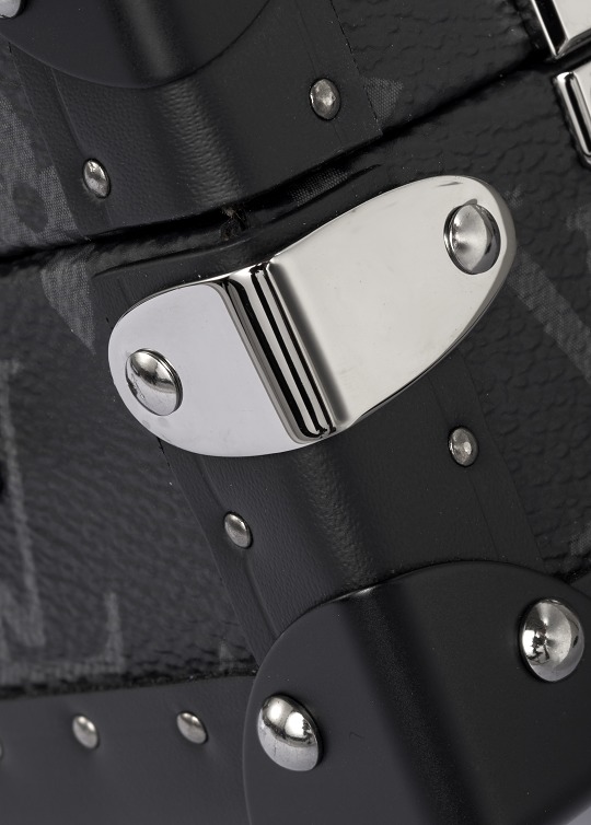 The Clutch Box looks like a miniature suitcase, with a collection of vintage locks, metal corners, leather trims and other craftsmanship details on the small package. The Trunk suitcase is reinforced with beech wood strips and rivets to make the structure more solid. The Clutch Box has evolved it into a black smooth calfskin strip trim and inlaid with round rivets.