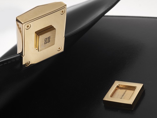 The 4G Logo was designed by brand founder Hubert de Givenchy in 1970 and has been used ever since. The logo consists of four brand initials "G", which are interpreted in bold black and straight lines. Through mirroring and other design techniques, it forms a centrally symmetrical square pattern , which is quite simple and modern.Matthew continues his love for industrial metal elements and transforms the 4G Logo into a three-dimensional geometric buckle . It is forged from gold-finished brass and engraved with the "4G" emblem.