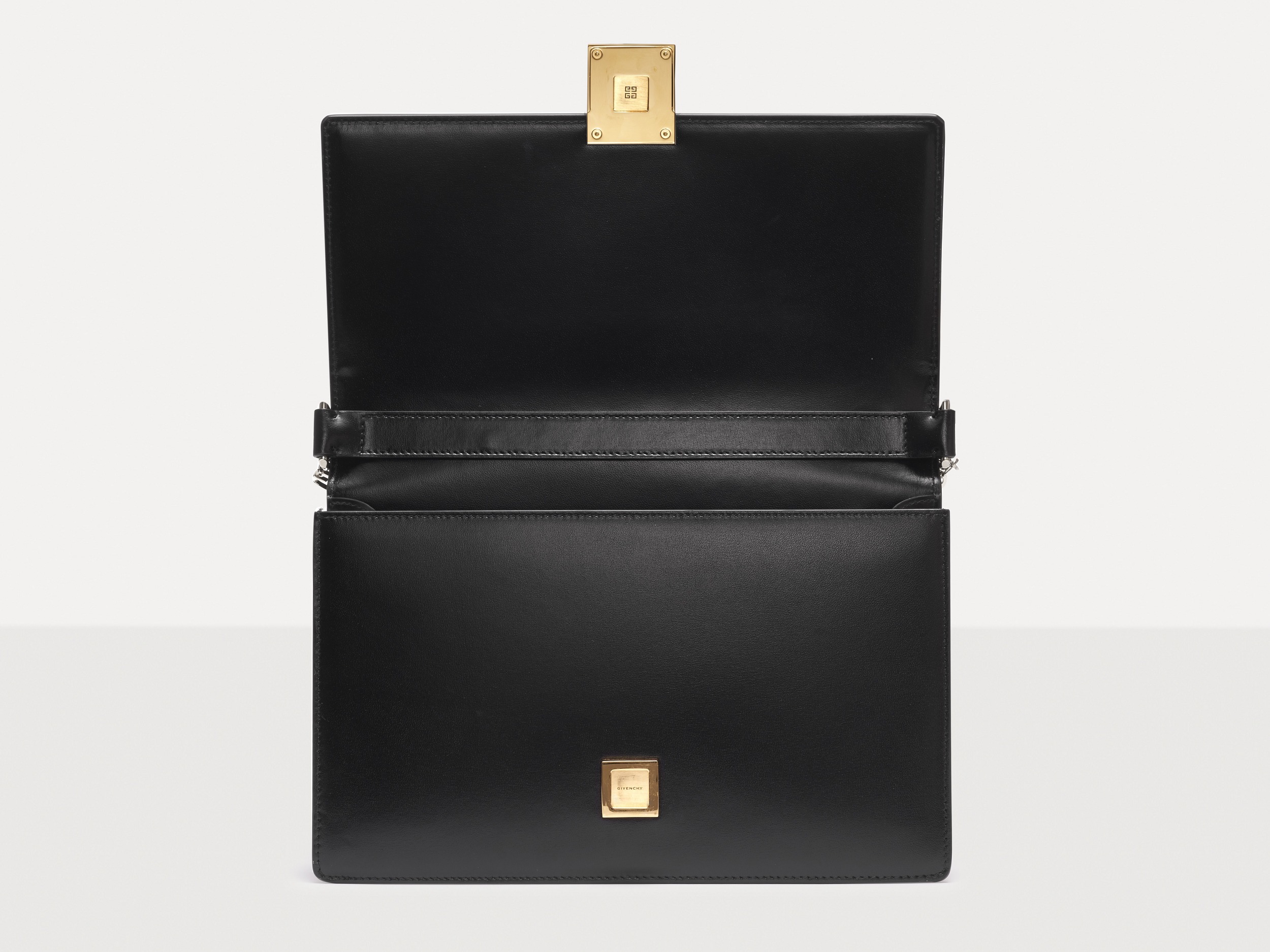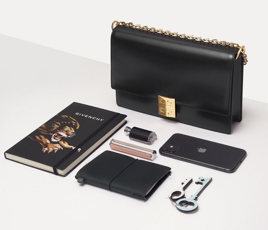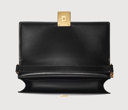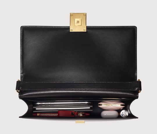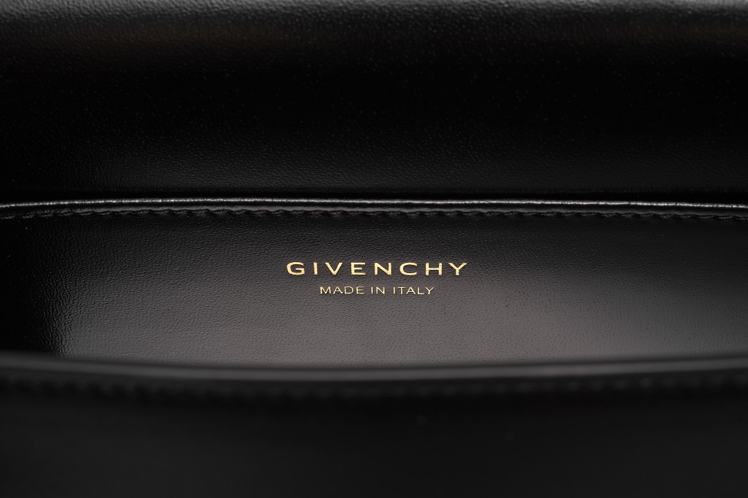 The cool style of the bag continues to the lining, which is made of pure black synthetic leather, with the "Givenchy" logo printed in gold on the details. The interior has an integrated space and a flat pocket . We put mobile phones, lipsticks, small perfumes, keys and other small items that are necessary when going out in the bag. It can also hold a notebook, so the storage capacity is quite good. However, due to the neat lines of the handbag itself, we do not recommend stuffing the bag too full.