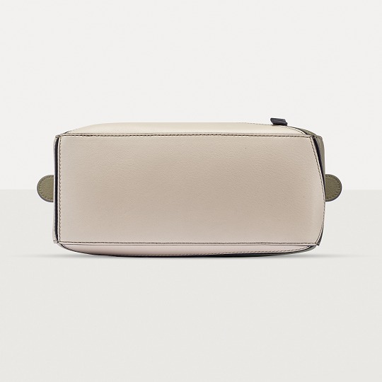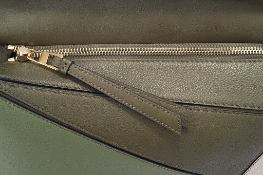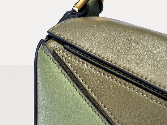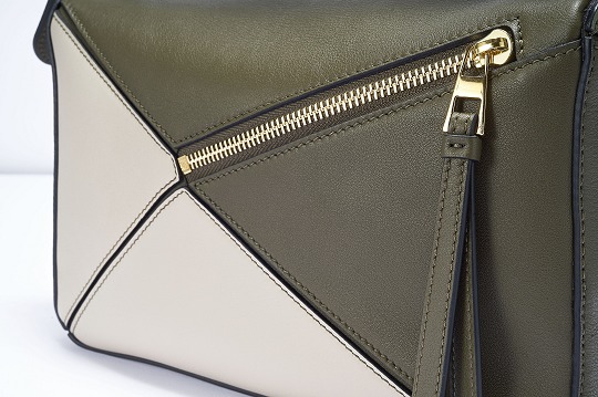 Although it is a small size of 24×16.5×10.5cm , the capacity of this Puzzle handbag is already practical enough. There is a zippered outer pocket on the back of the bag , set on the stitching line of different color blocks, which is used to store handy items. The lining is herringbone cotton canvas , and a leather label is sewn on the back.