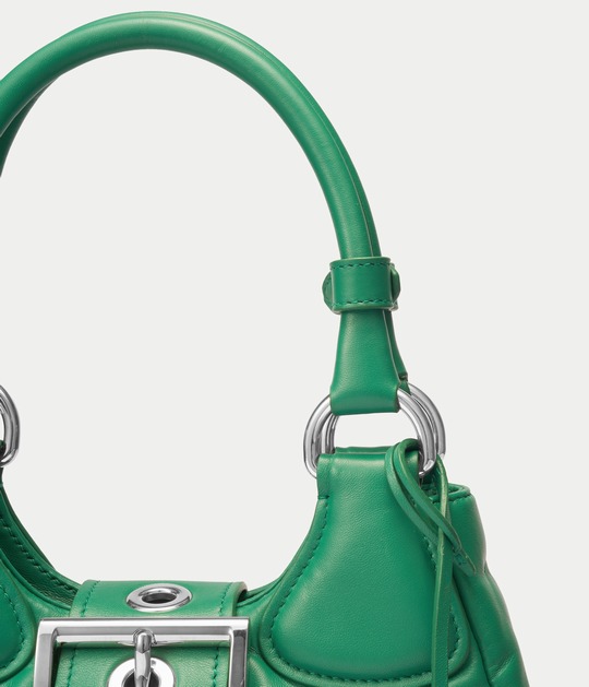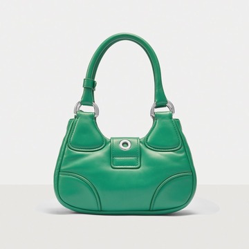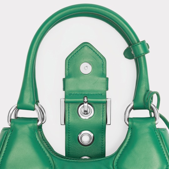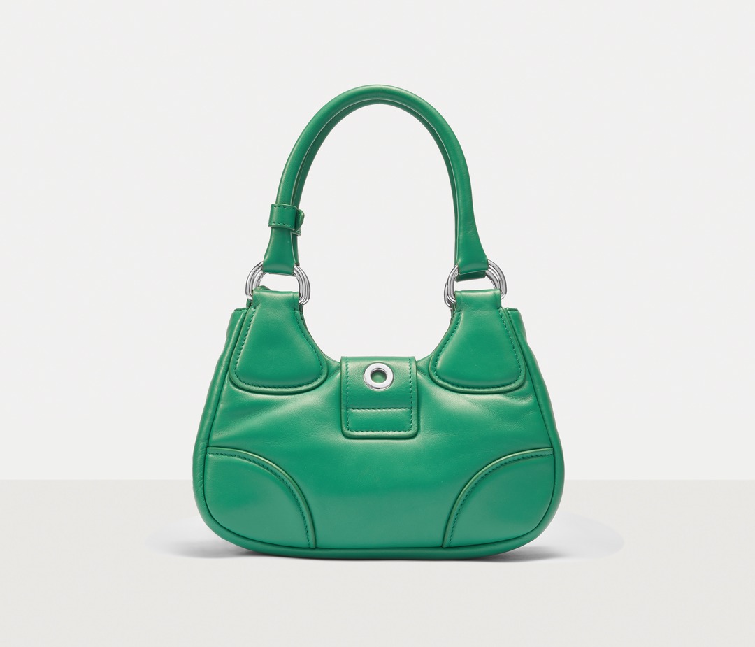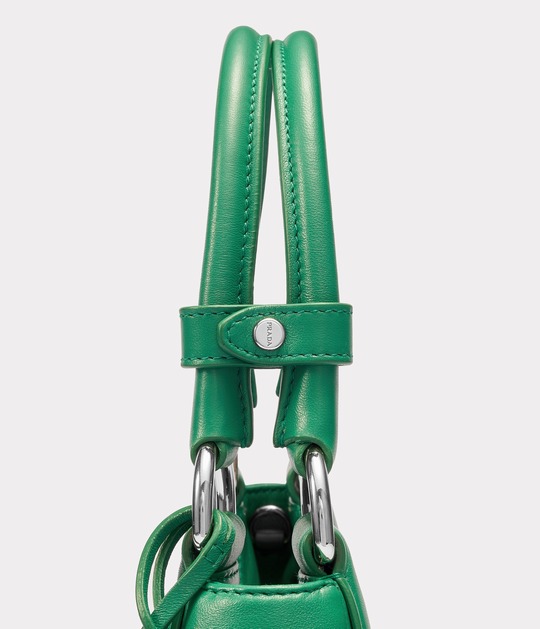 Moon has upright arched double handles , and the highlight is a studded buckle on one side to fix the two handles. The leather shoulder strap is detachable and adjustable , with a length of 100cm . The bag is suitable for carrying by hand or across the body, and it exudes a youthful vibe no matter how you carry it.