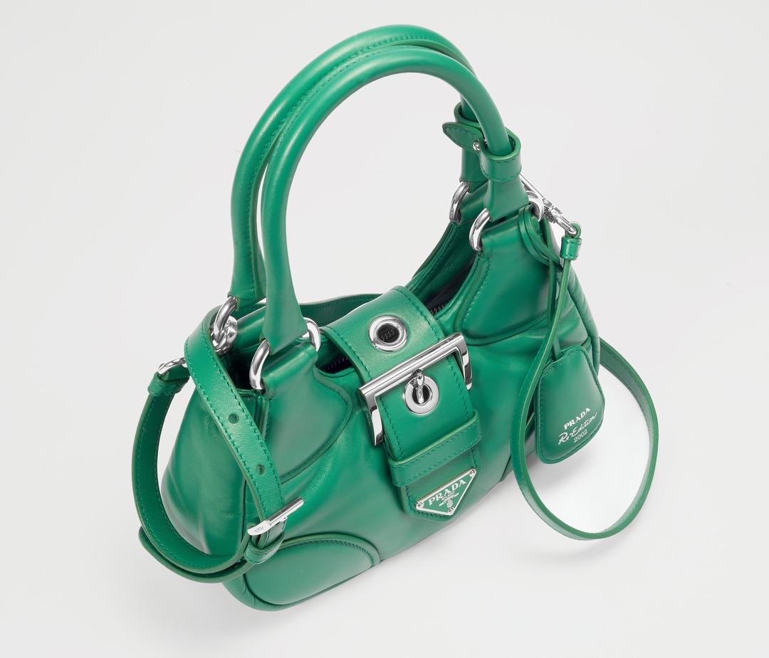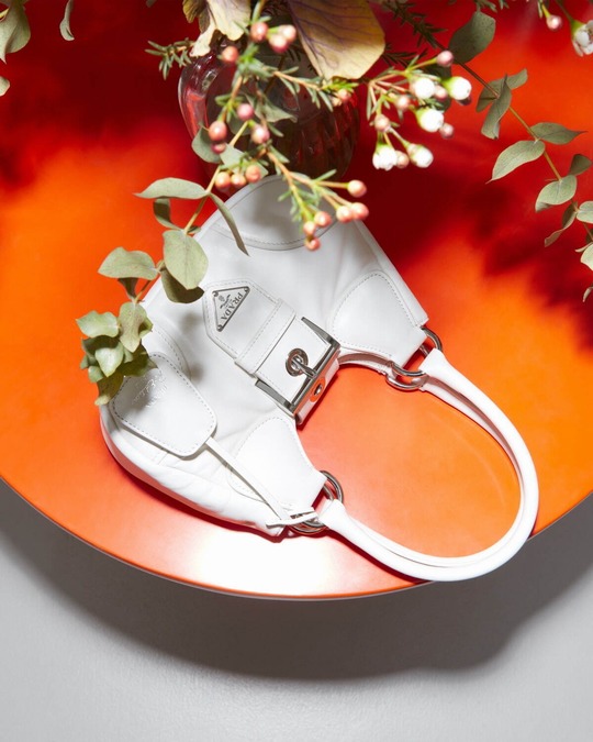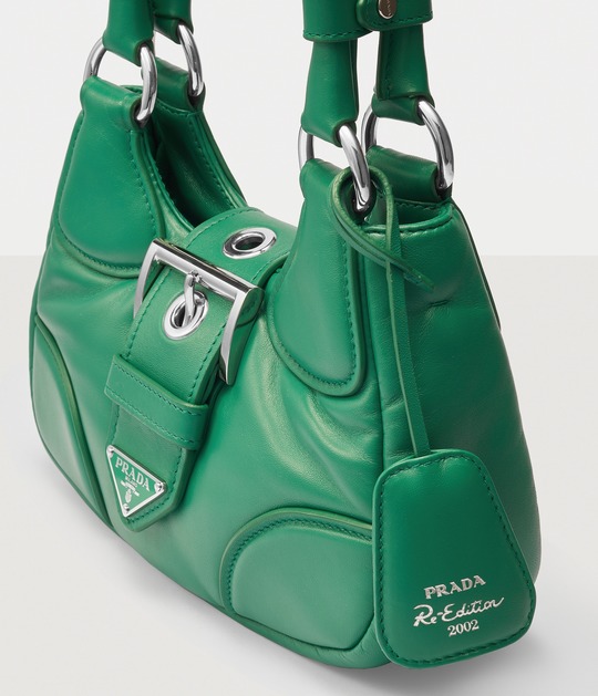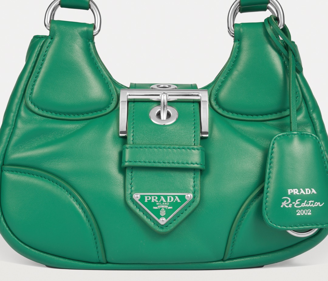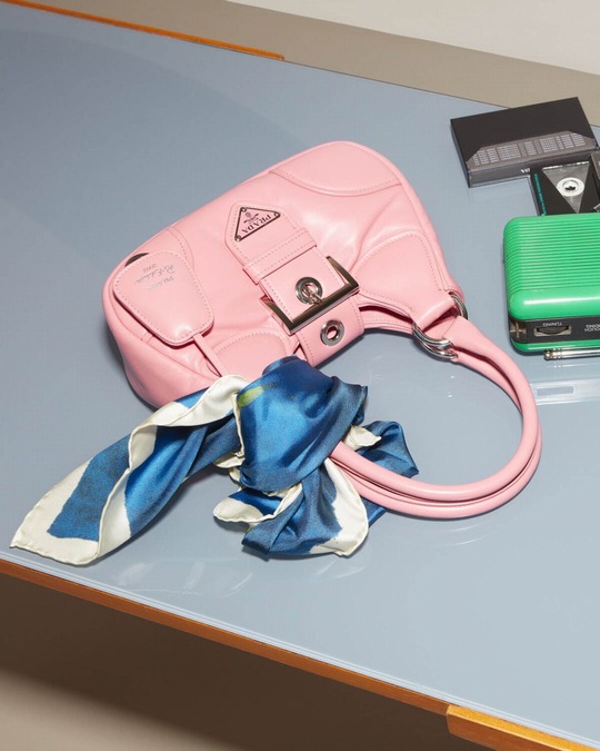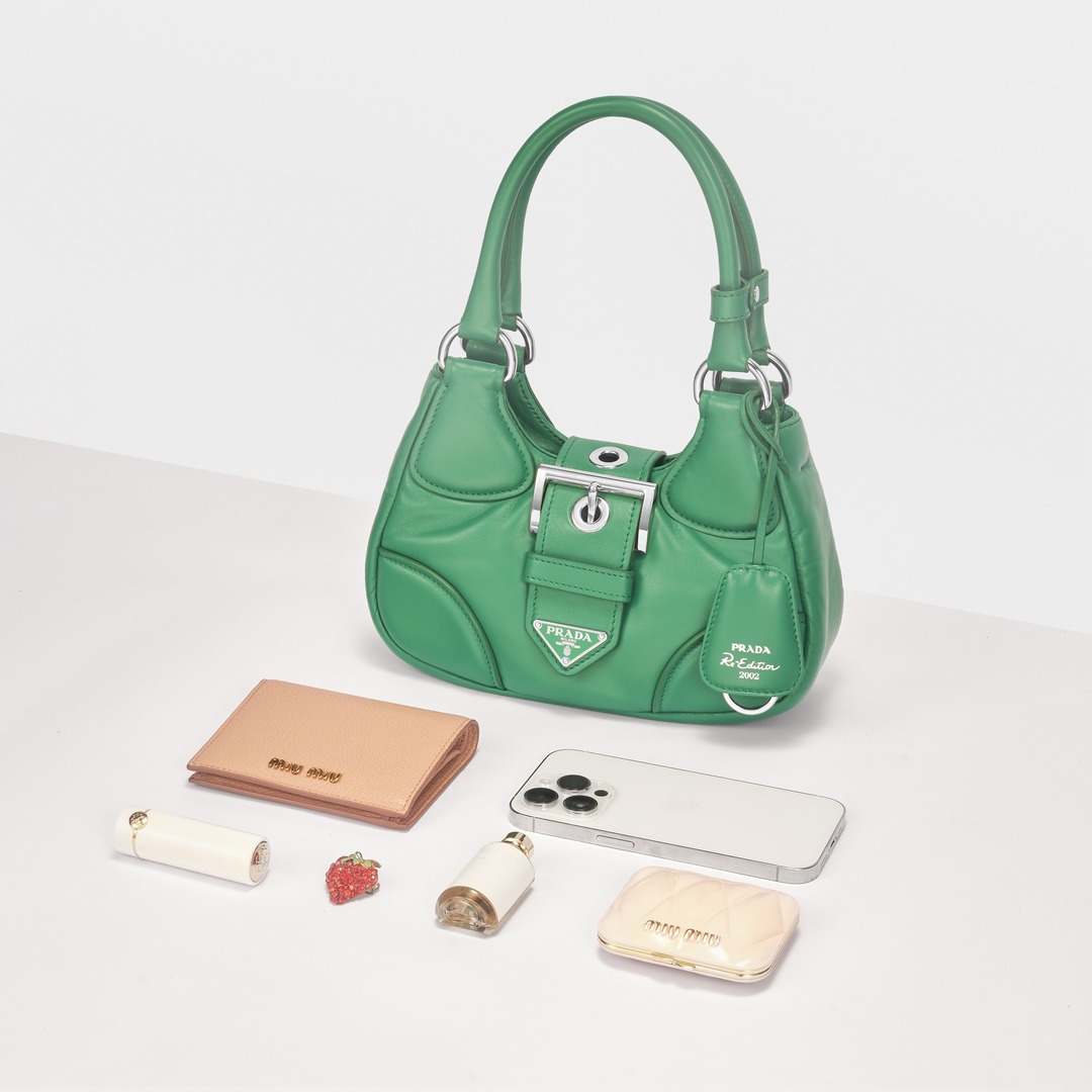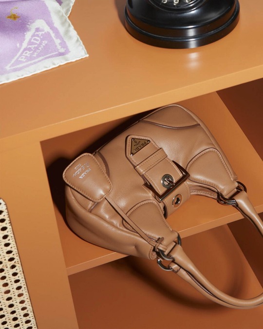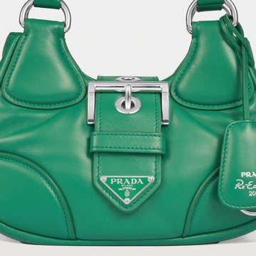 In comparison, the handbag follows the Hobo crescent shape , with PRADA's iconic nautical-style lock ring connecting the arched double handles; the most recognizable feature of the bag is the central belt buckle , and the new model adds the iconic enamel triangle logo on the basis of the original and optimizes and upgrades the craftsmanship. With details such as the leather patchwork corners , the overall look continues the retro feel.