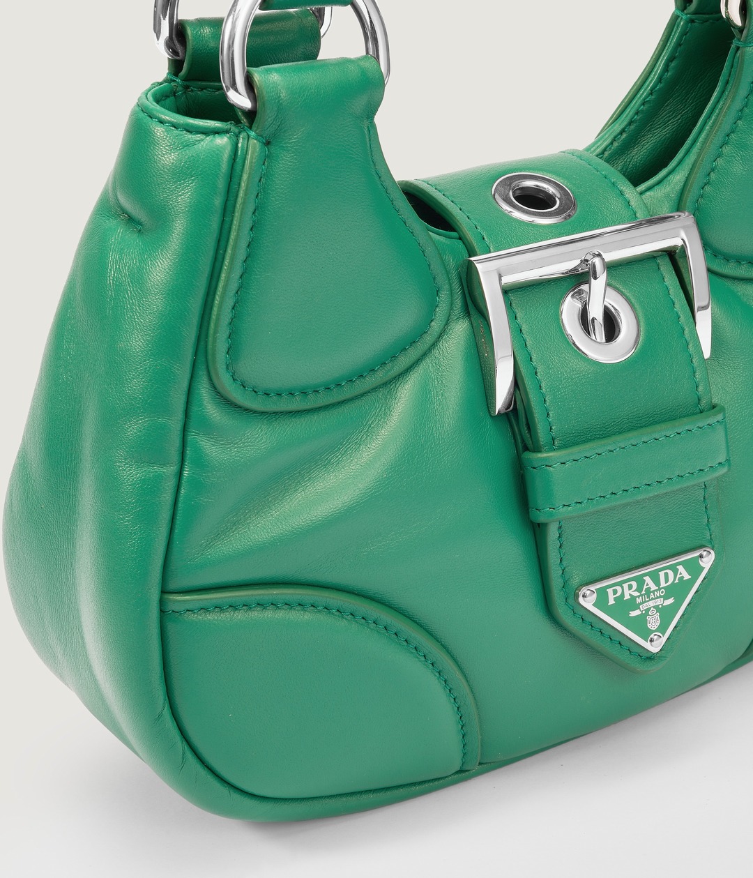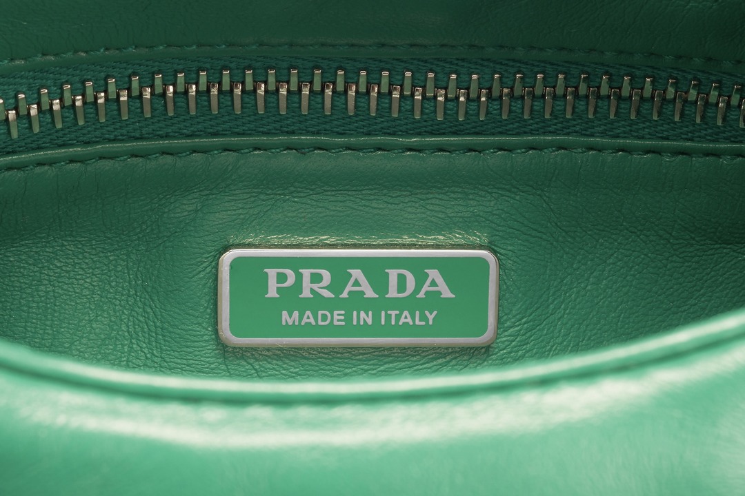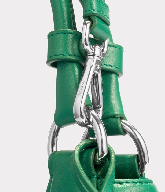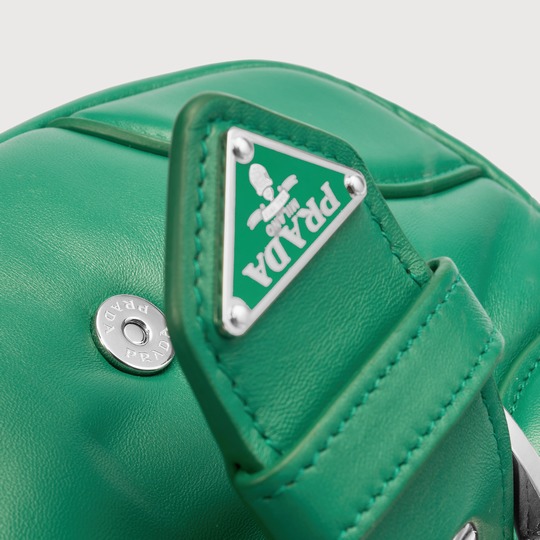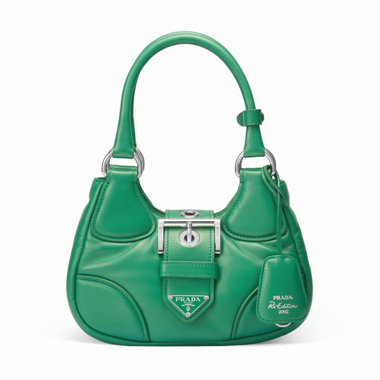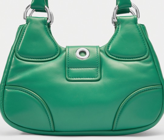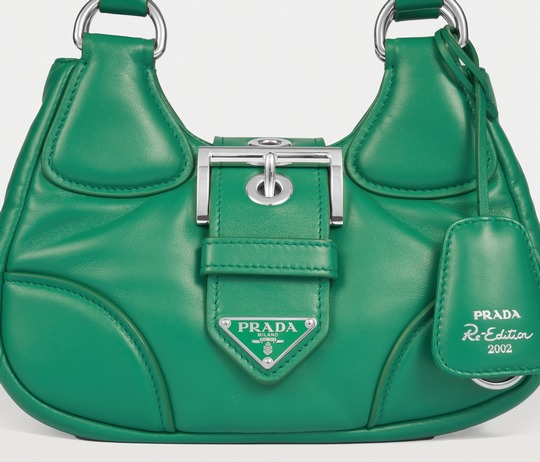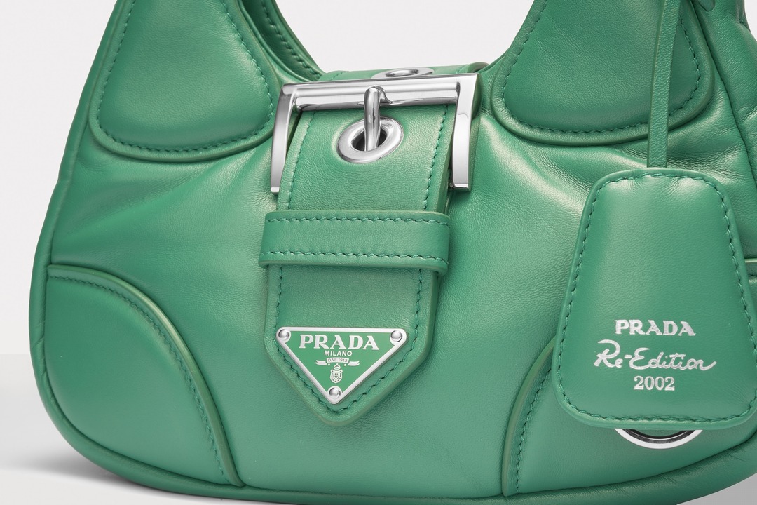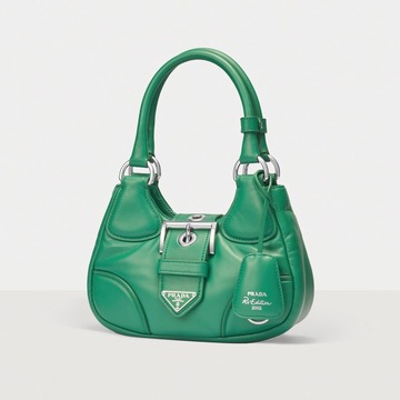 In comparison, the handbag follows the Hobo crescent shape , with PRADA's iconic nautical-style lock ring connecting the arched double handles; the most recognizable feature of the bag is the central belt buckle , and the new model adds the iconic enamel triangle logo on the basis of the original and optimizes and upgrades the craftsmanship. With details such as the leather patchwork corners , the overall look continues the retro feel.