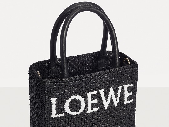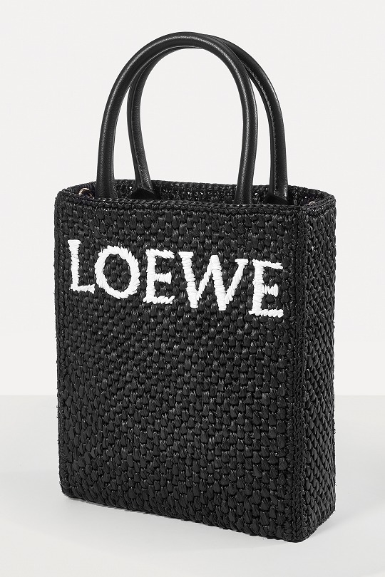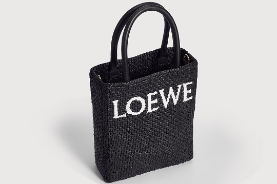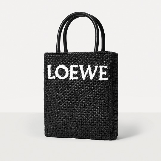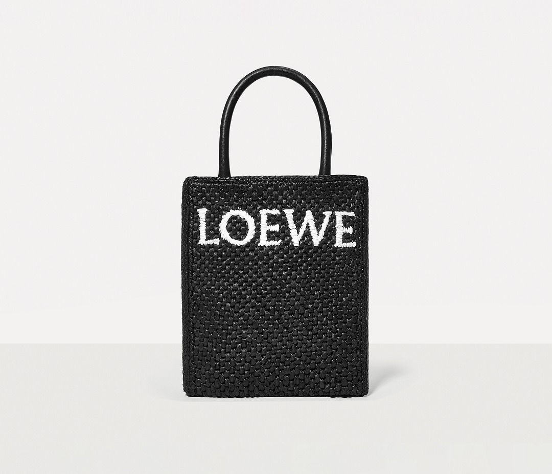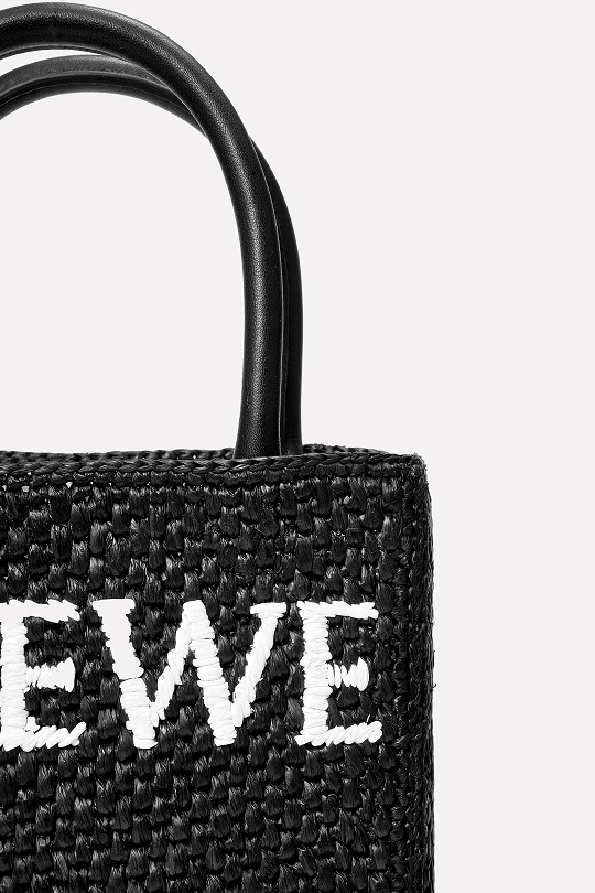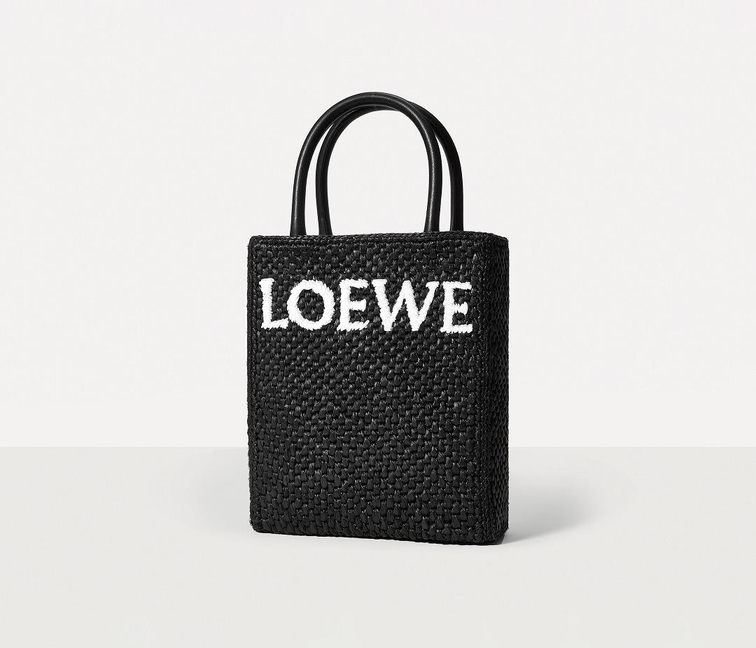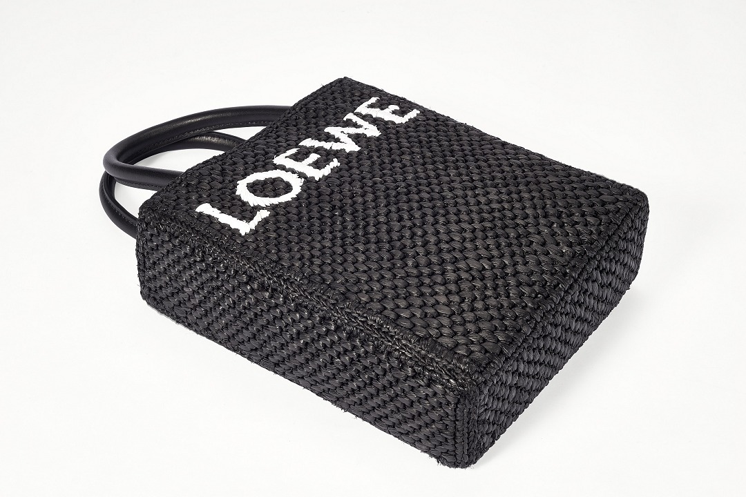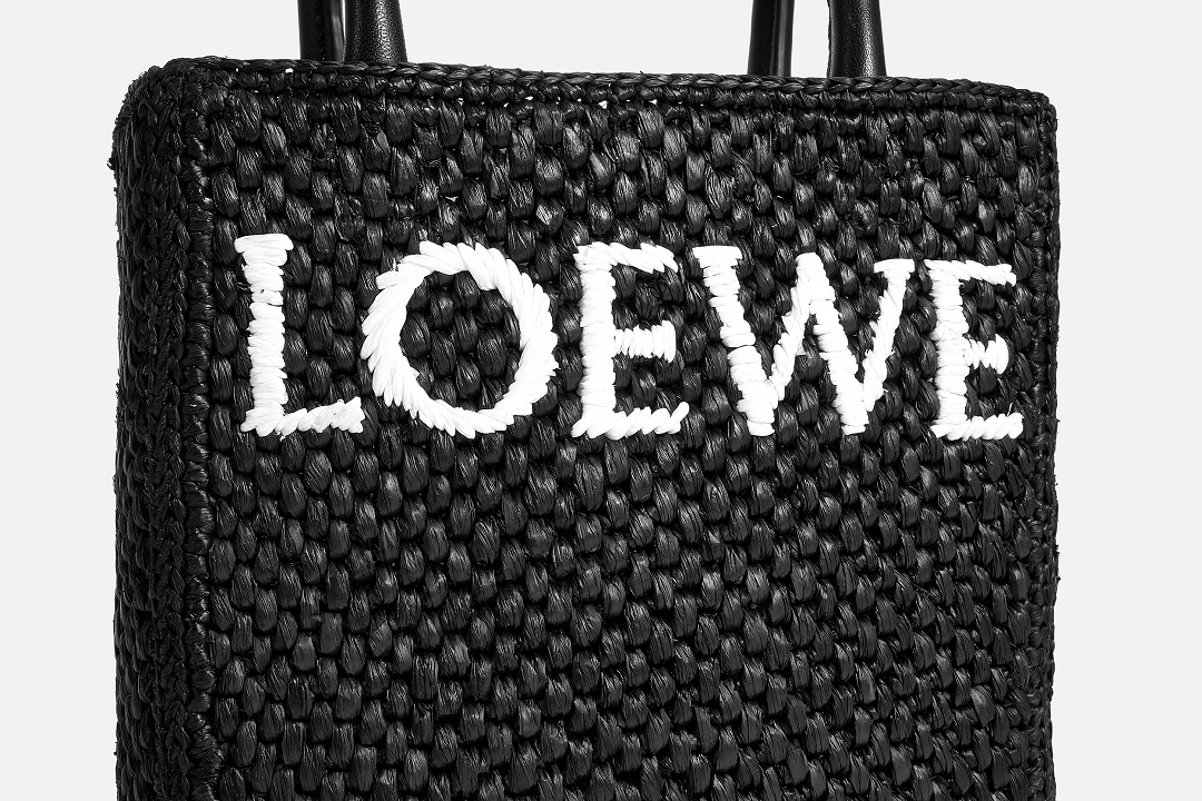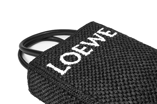 The black bag is decorated with white raffia fiber LOEWE letter logo through embroidery , which is straightforward and visually impactful.