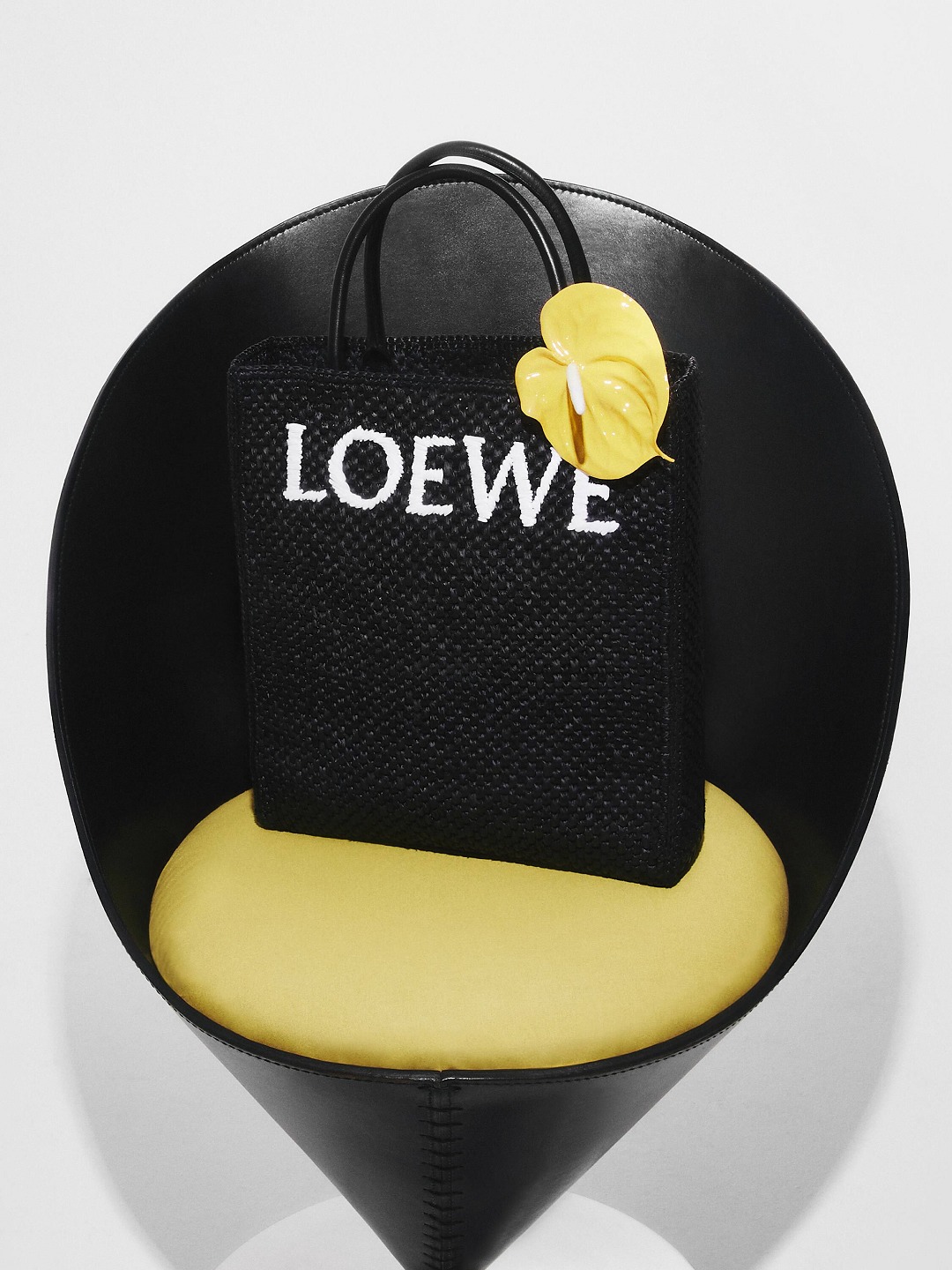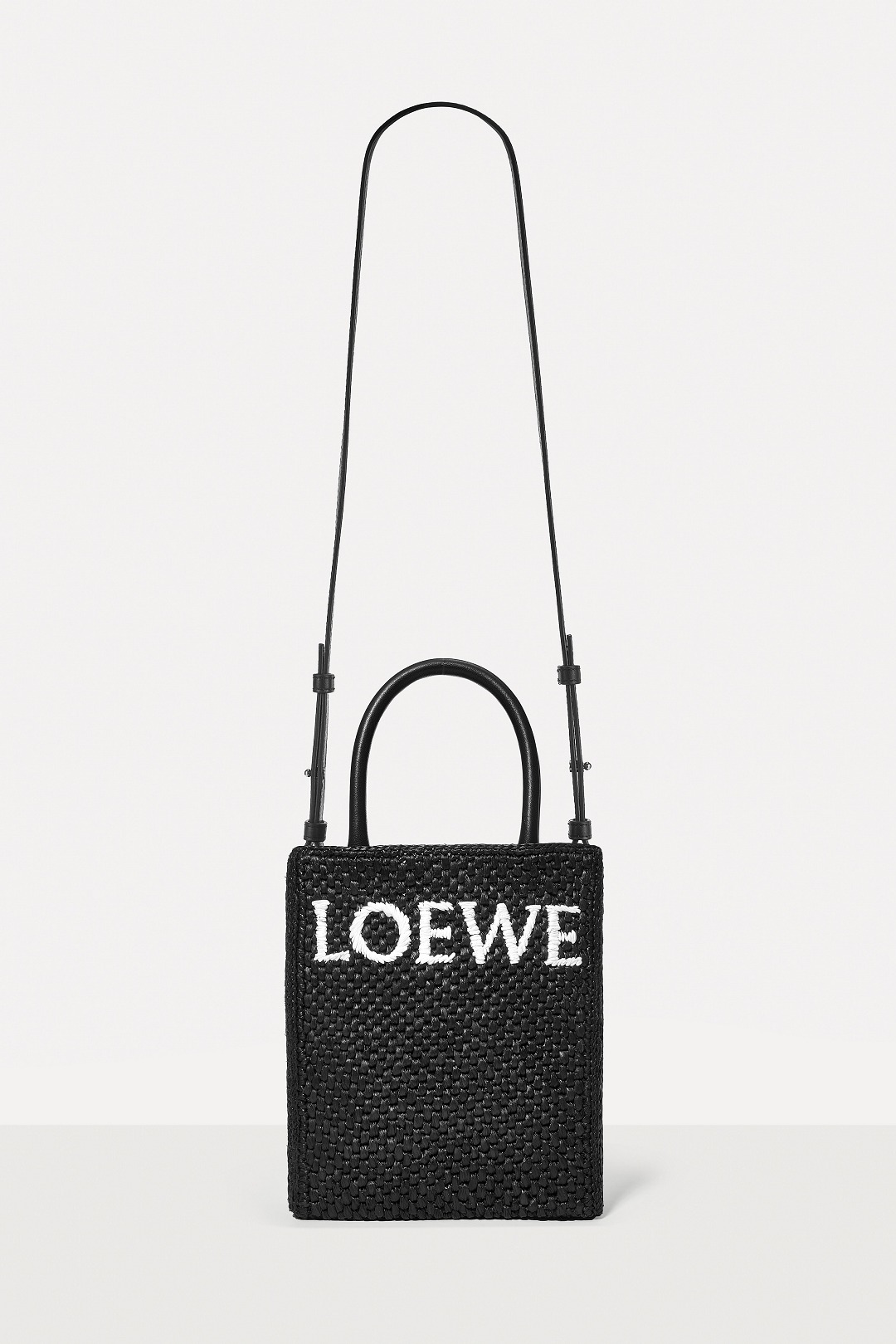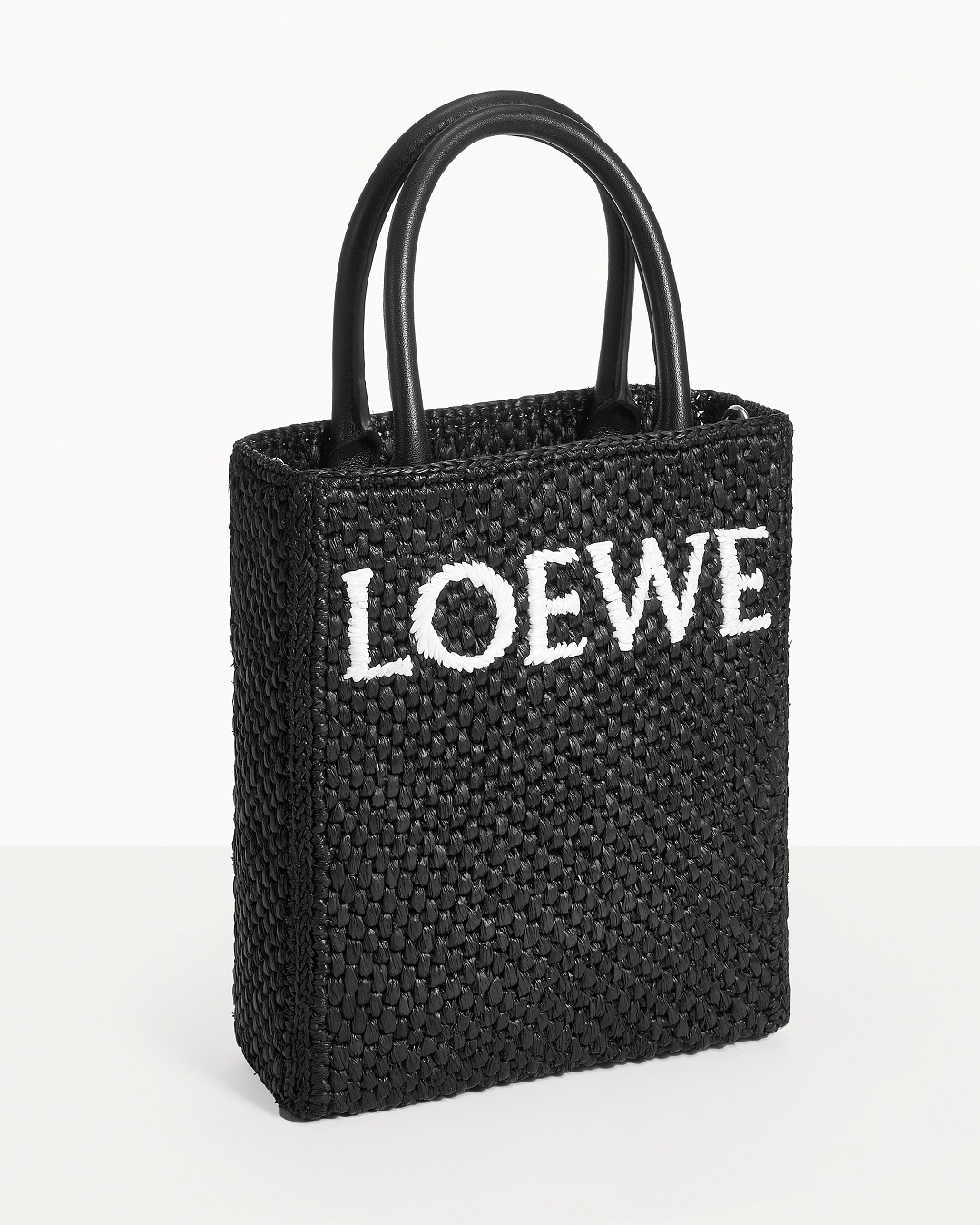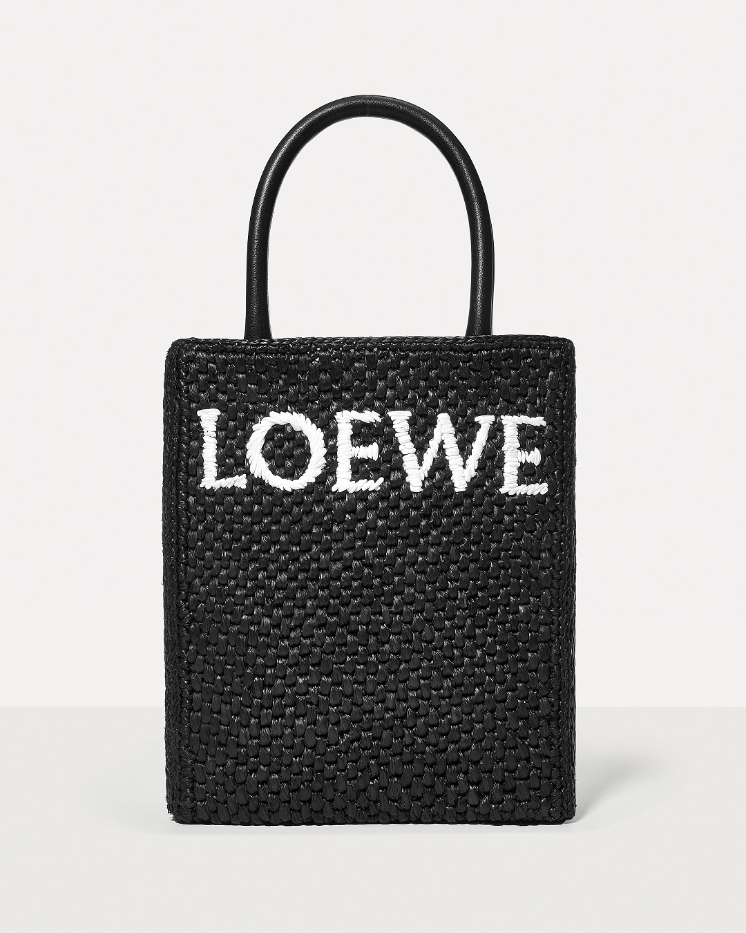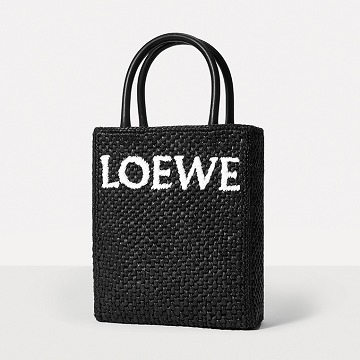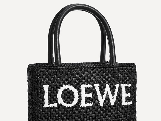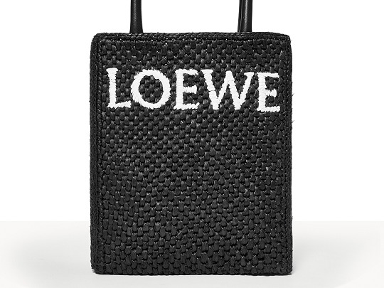 The black bag is decorated with white raffia fiber LOEWE letter logo through embroidery , which is straightforward and visually impactful.