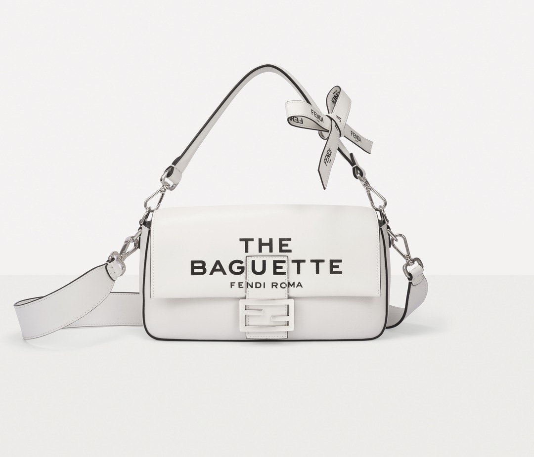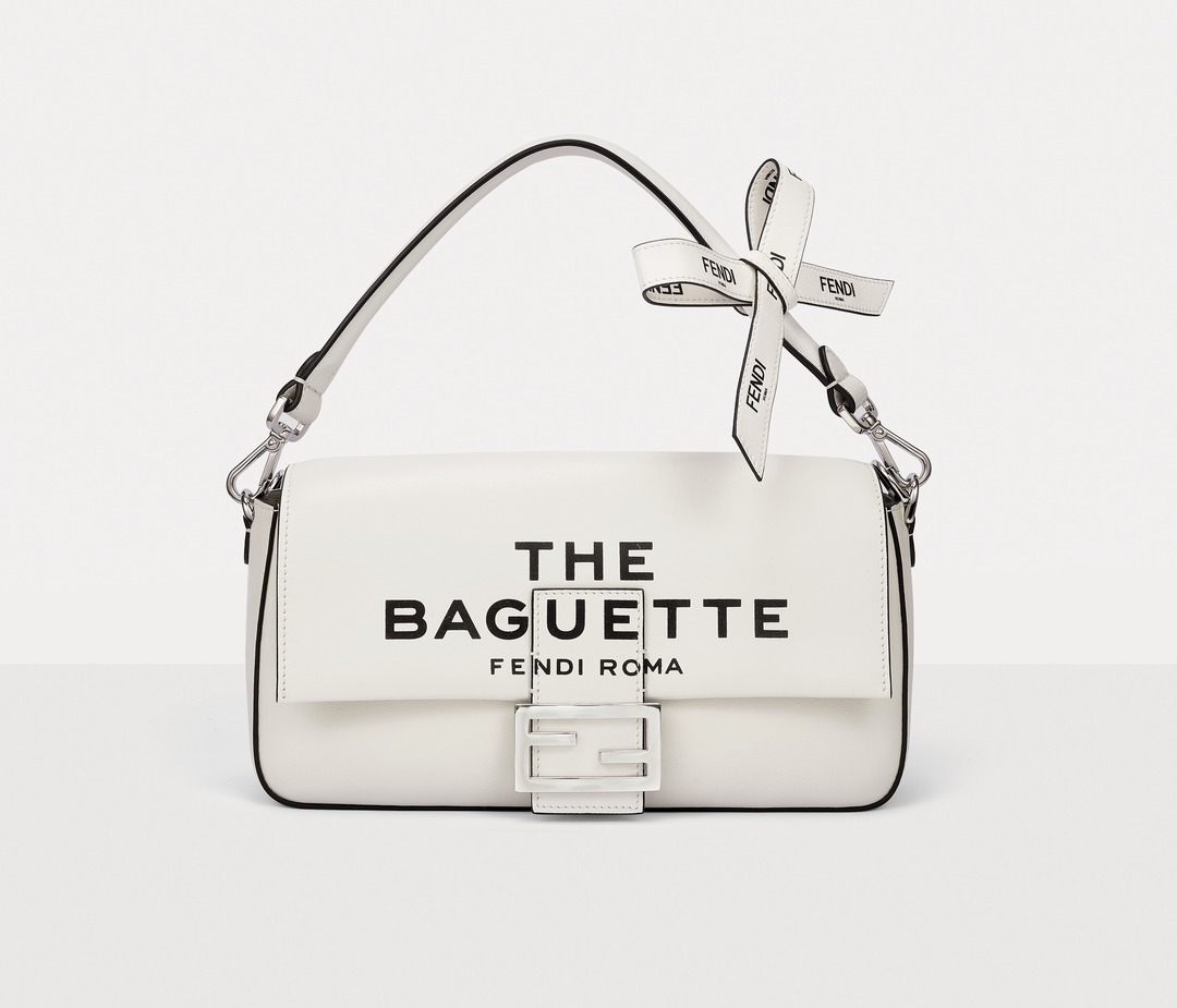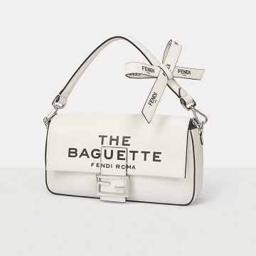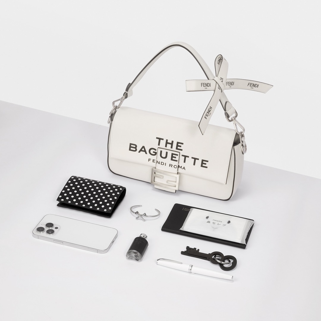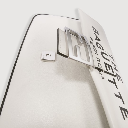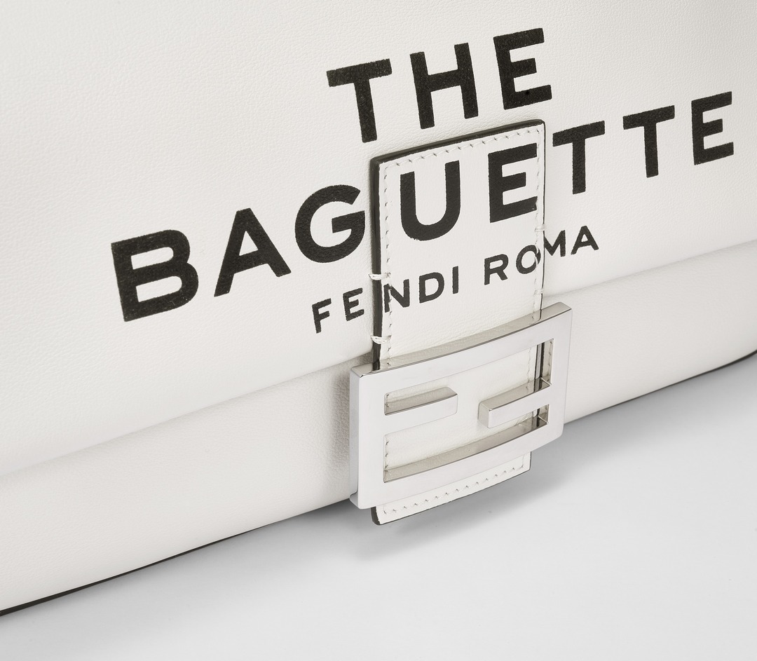 This capsule series is presented in a striking black and white contrast color - using white calfskin as the background, and the black oil edge is outlined like a marker. The "THE BAGUETTE FENDI Roma" black letter logo is printed in the center, which is straightforward and full of visual impact.