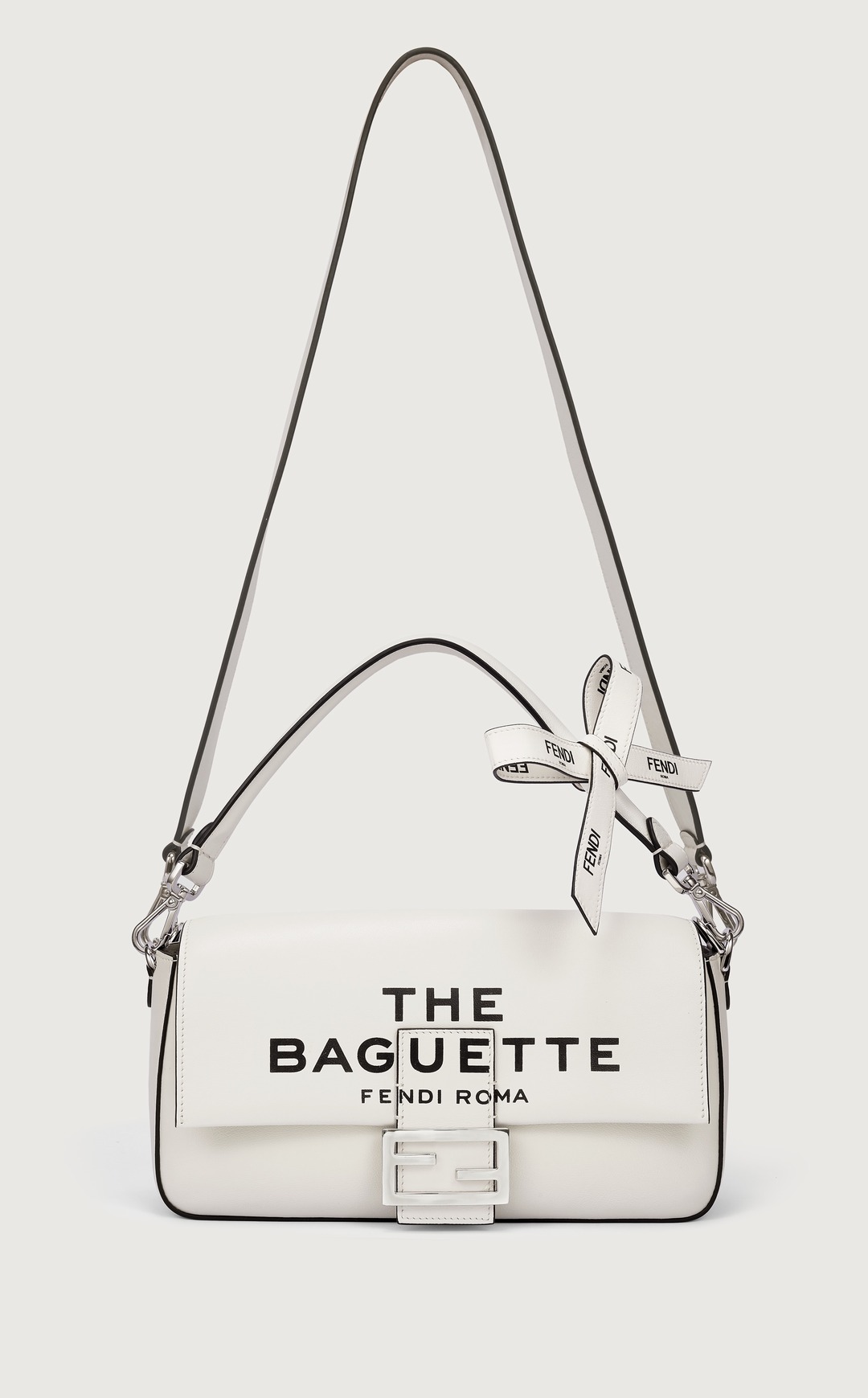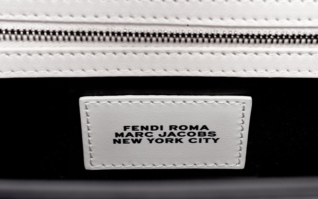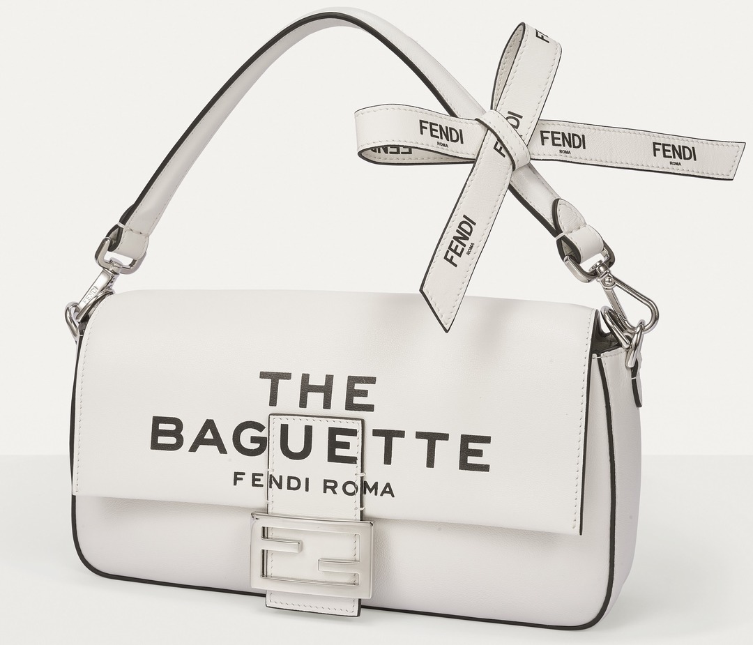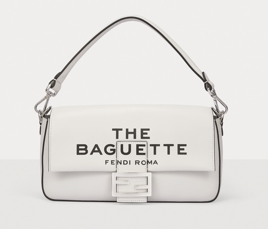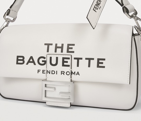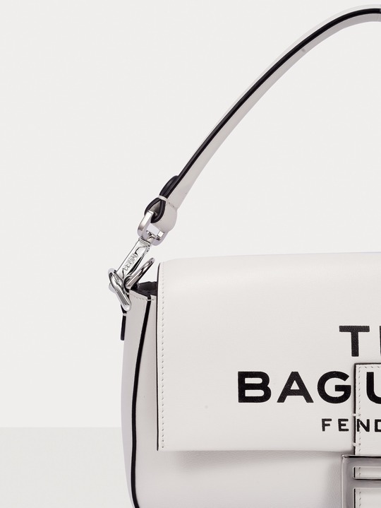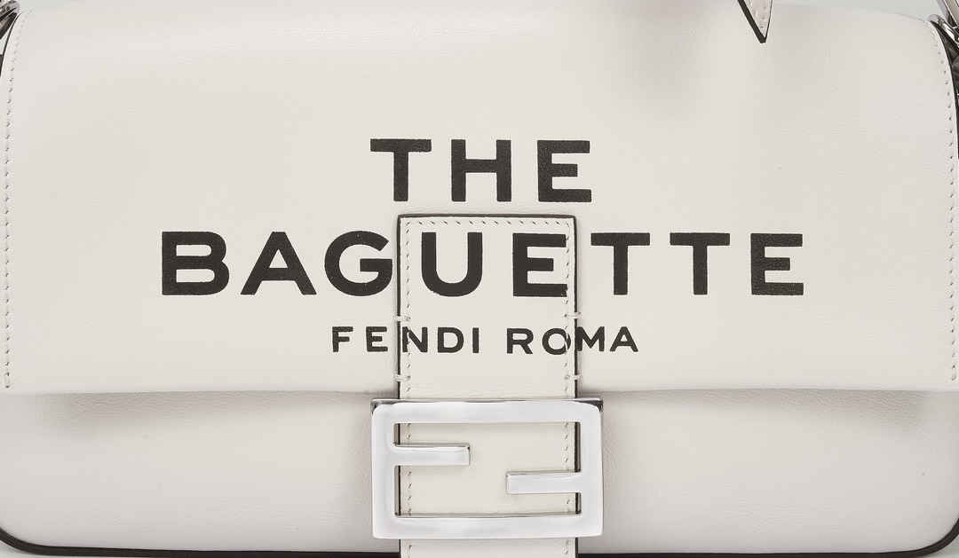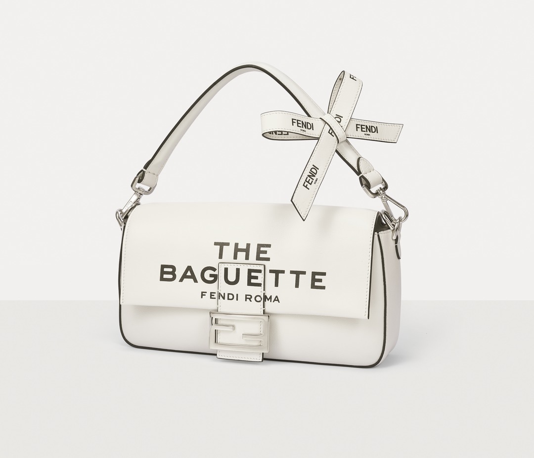 This capsule series is presented in a striking black and white contrast color - using white calfskin as the background, and the black oil edge is outlined like a marker. The "THE BAGUETTE FENDI Roma" black letter logo is printed in the center, which is straightforward and full of visual impact.