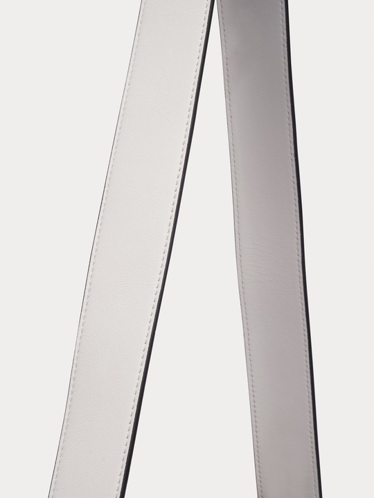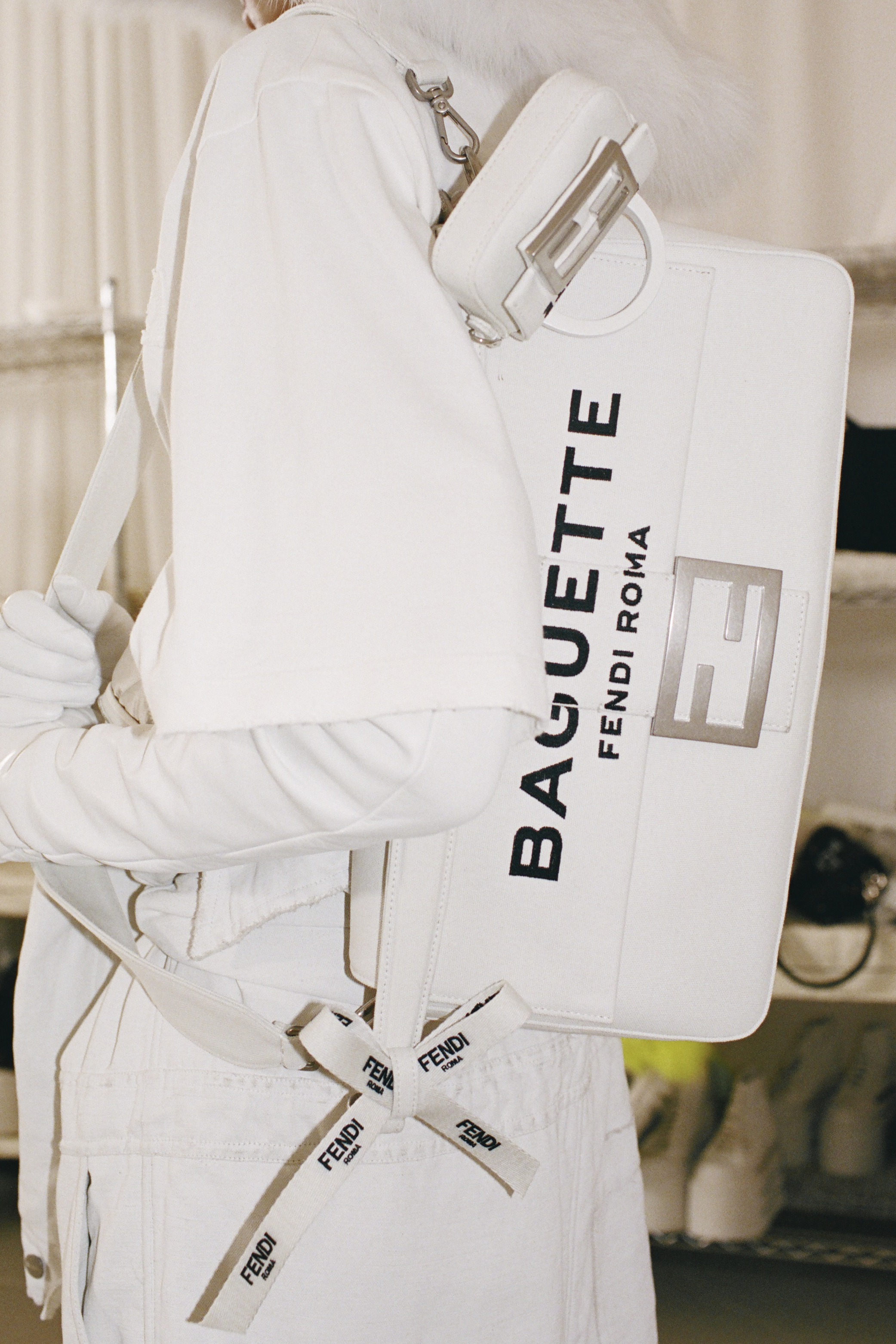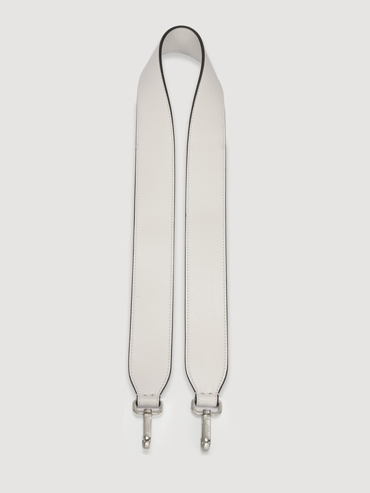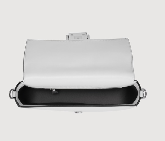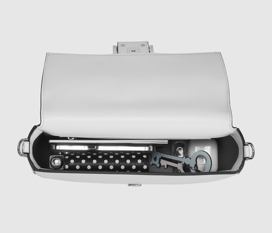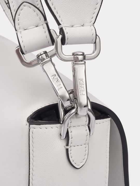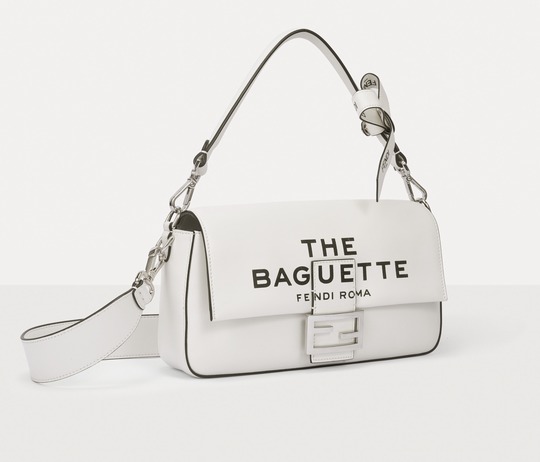 The Baguette is equipped with a detachable handle , so that the bag can be carried by hand or folded under the arm, or it can be tucked under one shoulder to become a true "baguette bag"; it is also equipped with a detachable long shoulder strap made of minimalist white calfskin to add a casual crossbody carrying method.