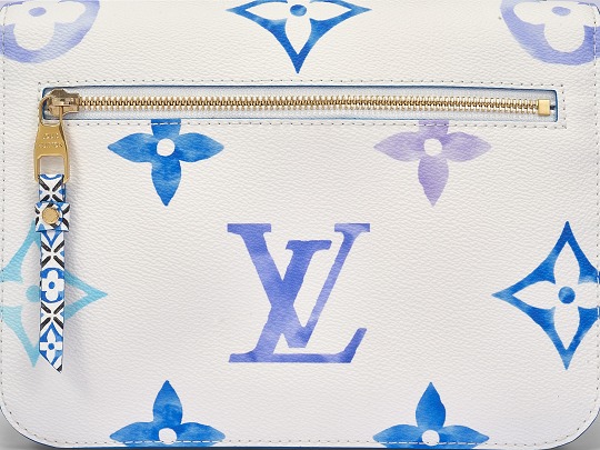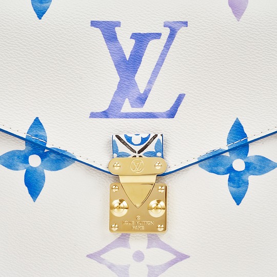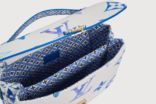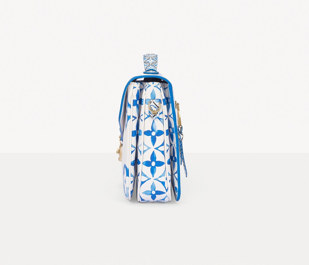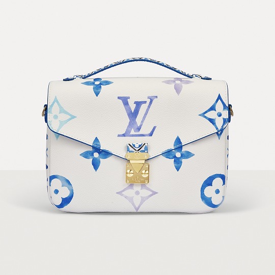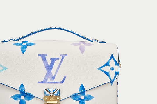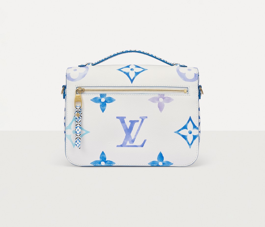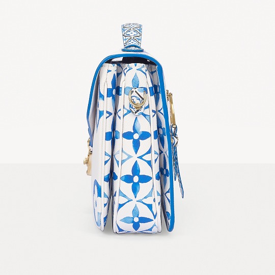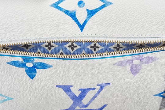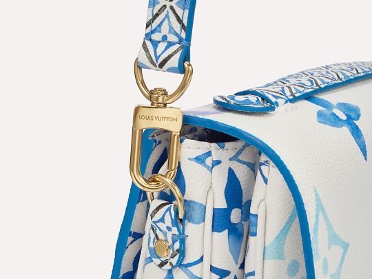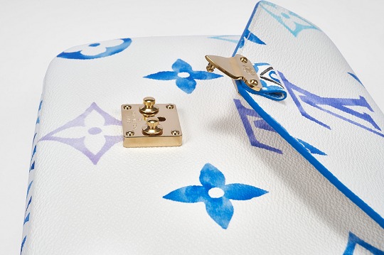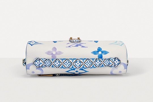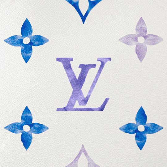 The new summer series combines the brand's classic Monogram flowers, LV letters and mosaic tile patterns . The gradient tones create a watercolor -like misty mood, presenting a light and moist look, reminiscent of a swimming pool with rippling water in summer. There are 4 different sizes of Monogram prints on the bag body and they are distributed symmetrically. The front and back sides are watercolor graffiti-style LV letters and Giant Monogram patterns . The sides and bottom of the bag are spliced with blue and white tile patterns. The printed patterns on the handles, shoulder straps and lining are added with black details, which are closer to the overall mosaic tile style. The scattered tile patterns are like different facades of a building. The blue hand-painted oil edges and white leather piping outline the three-dimensional body silhouette.