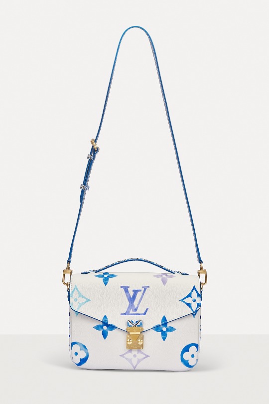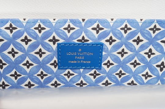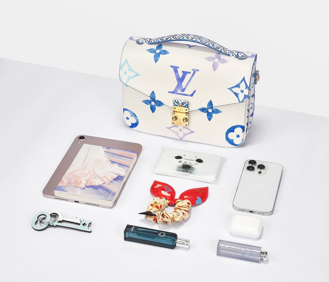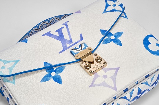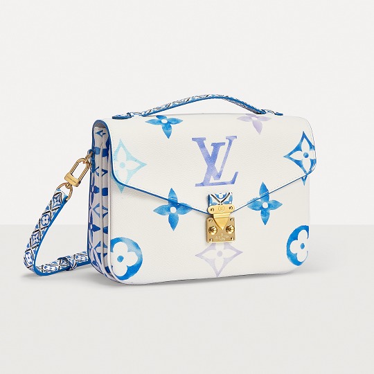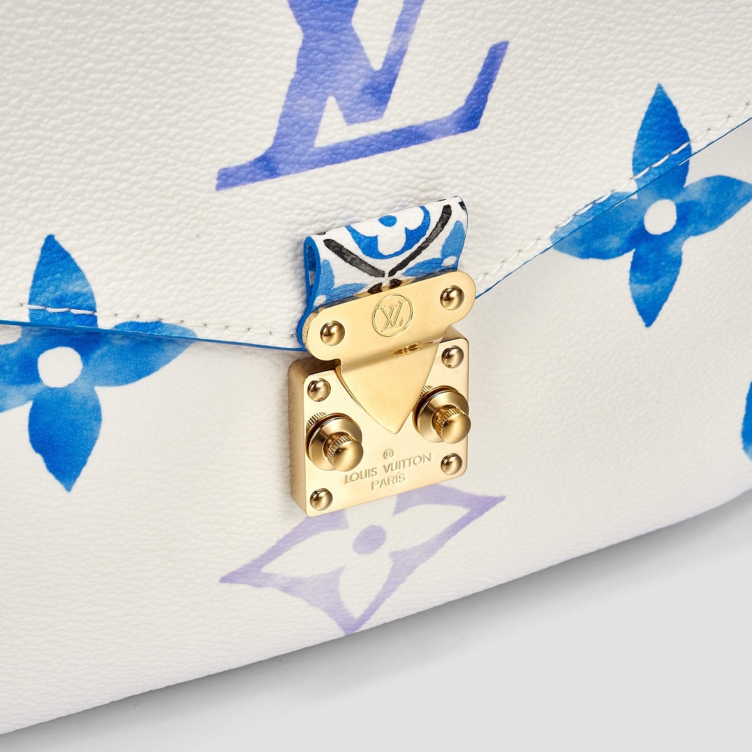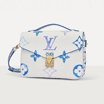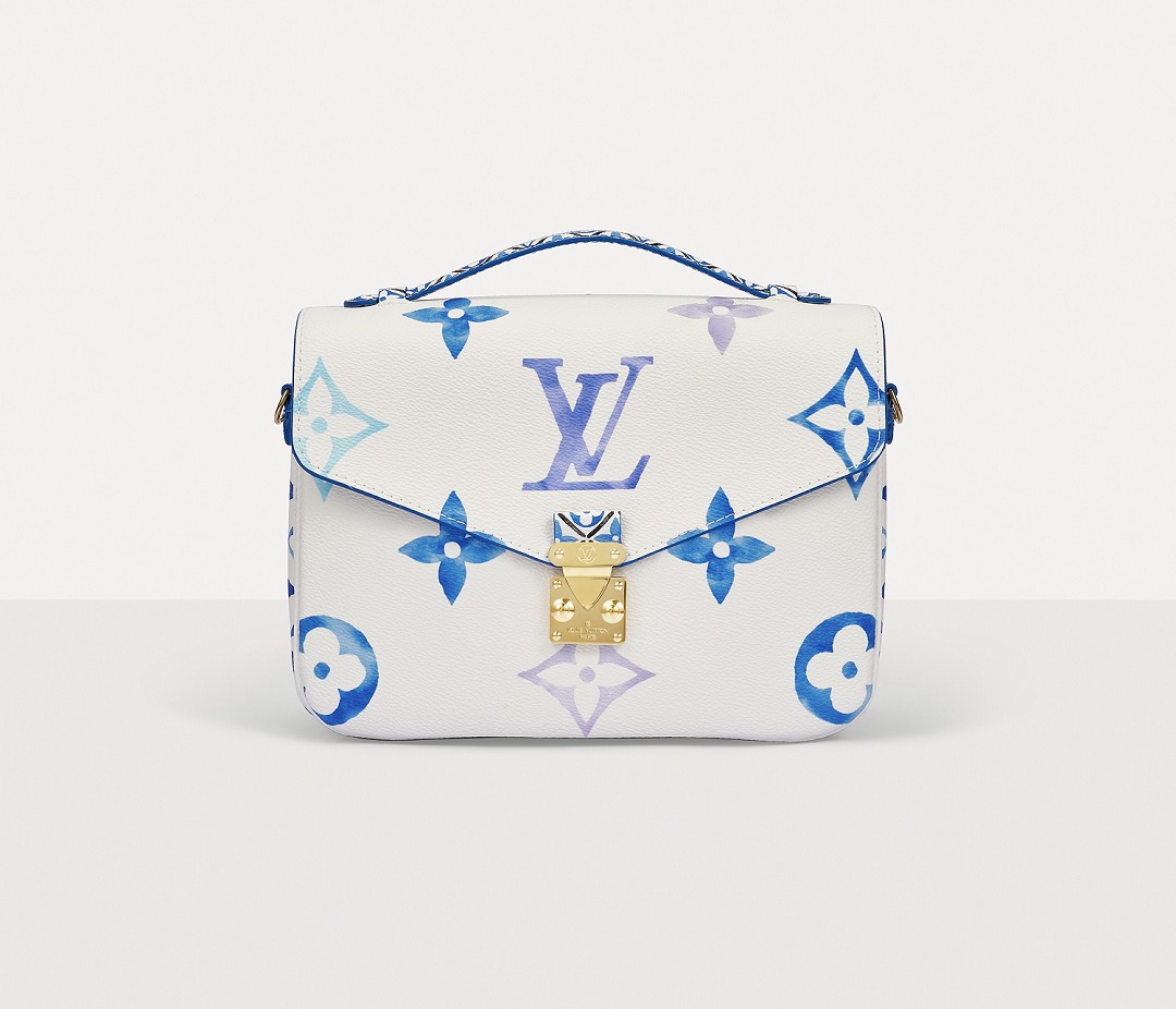 The new summer series combines the brand's classic Monogram flowers, LV letters and mosaic tile patterns . The gradient tones create a watercolor -like misty mood, presenting a light and moist look, reminiscent of a swimming pool with rippling water in summer. There are 4 different sizes of Monogram prints on the bag body and they are distributed symmetrically. The front and back sides are watercolor graffiti-style LV letters and Giant Monogram patterns . The sides and bottom of the bag are spliced with blue and white tile patterns. The printed patterns on the handles, shoulder straps and lining are added with black details, which are closer to the overall mosaic tile style. The scattered tile patterns are like different facades of a building. The blue hand-painted oil edges and white leather piping outline the three-dimensional body silhouette.