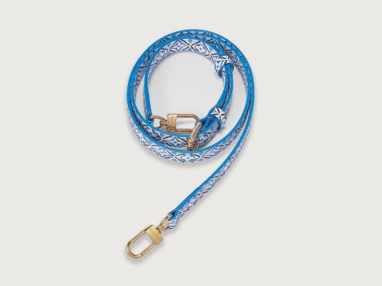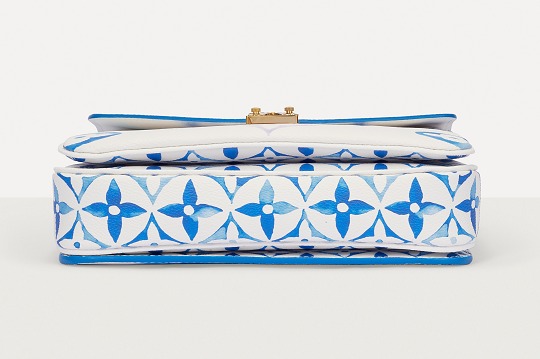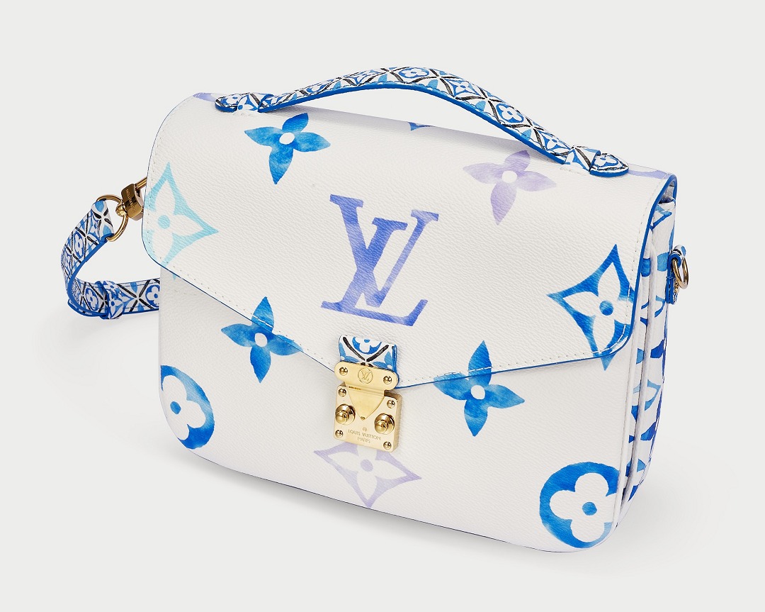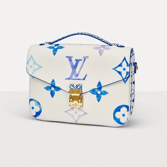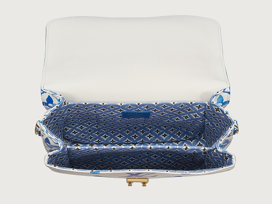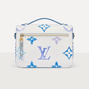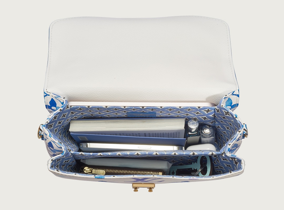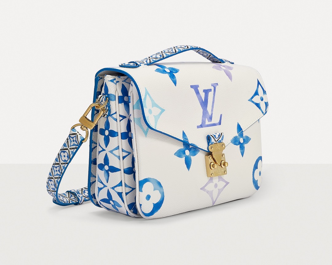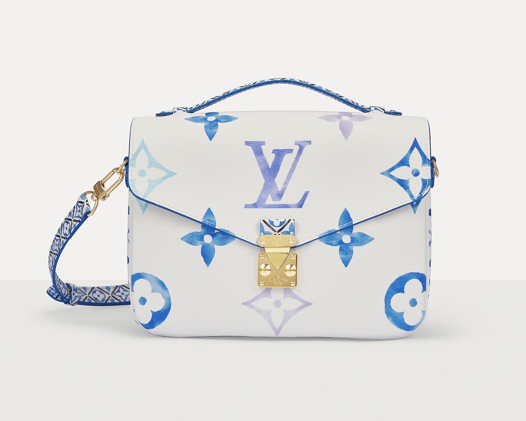 The new summer series combines the brand's classic Monogram flowers, LV letters and mosaic tile patterns . The gradient tones create a watercolor -like misty mood, presenting a light and moist look, reminiscent of a swimming pool with rippling water in summer. There are 4 different sizes of Monogram prints on the bag body and they are distributed symmetrically. The front and back sides are watercolor graffiti-style LV letters and Giant Monogram patterns . The sides and bottom of the bag are spliced with blue and white tile patterns. The printed patterns on the handles, shoulder straps and lining are added with black details, which are closer to the overall mosaic tile style. The scattered tile patterns are like different facades of a building. The blue hand-painted oil edges and white leather piping outline the three-dimensional body silhouette.