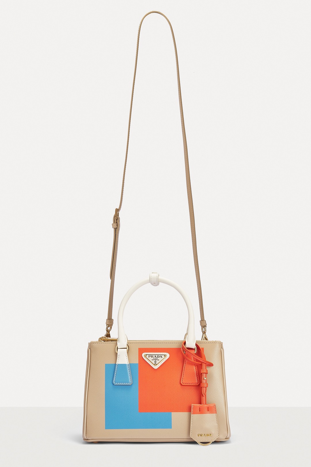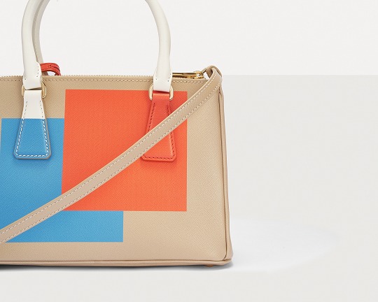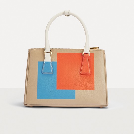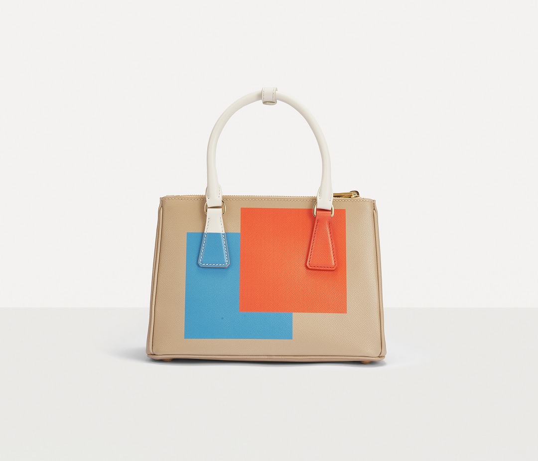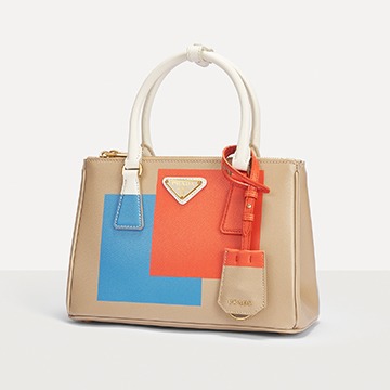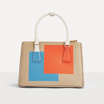 This special edition handbag is made of desert yellow Saffiano leather with eye-catching orange and blue square prints on both sides . The contrasting pattern breaks through the binary plane and spreads to the detachable leather key ring and handle. The bright color blocks are reminiscent of Mondrian's abstract paintings. The geometric lines and the refined body lines complement each other, injecting vitality into the bag.