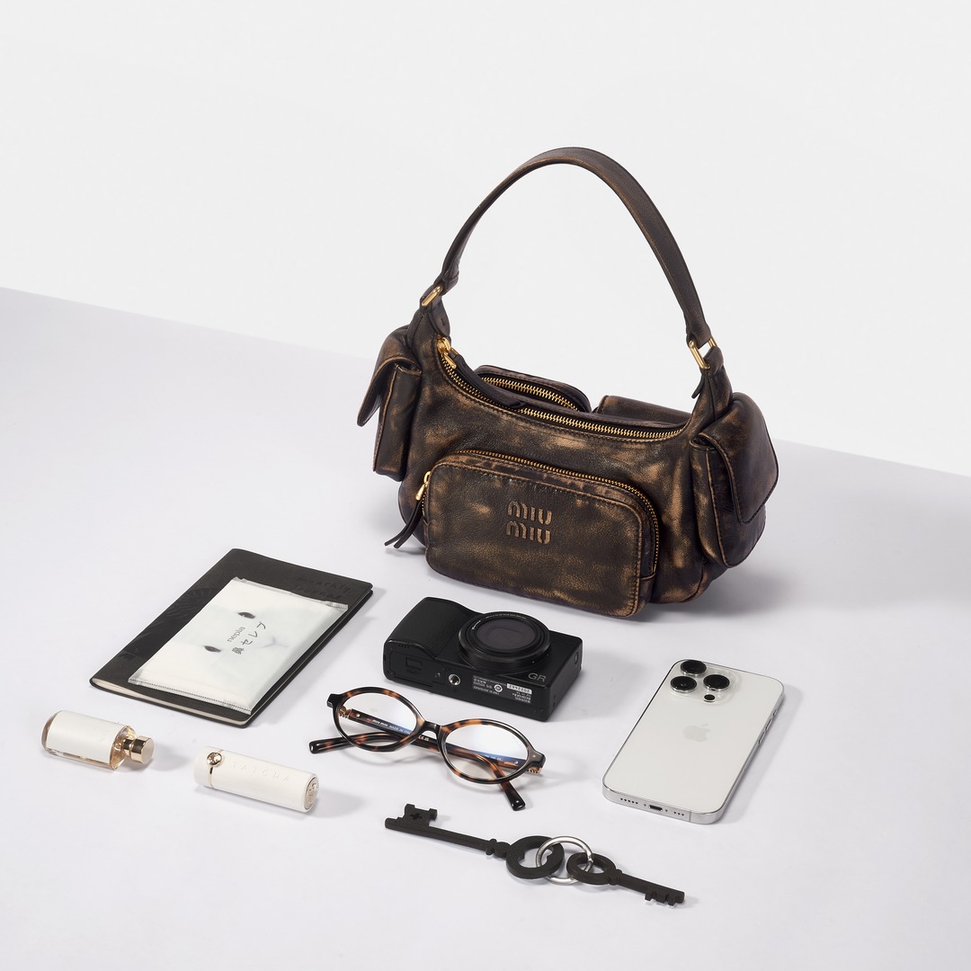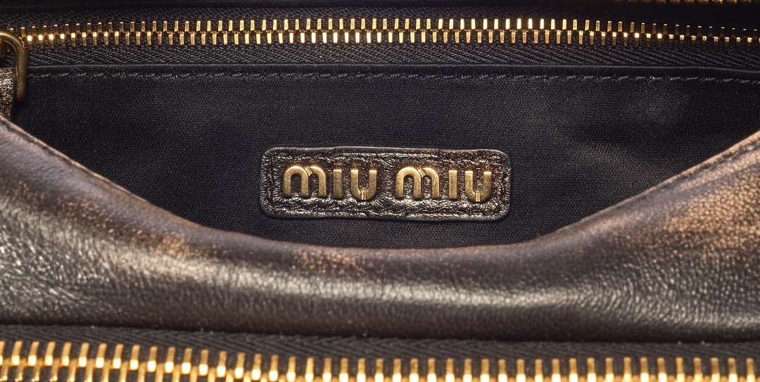 The lining of the bag is made of black cotton satin with a Miu Miu metal logo patch. The 5 pockets plus the main compartment make the total storage space 6 , making the small shoulder bag super large and can be sorted. We put a camera, glasses, mobile phone, notebook, makeup items and keys in the bag. If you make good use of the 5 small pockets, the functionality will be up~
