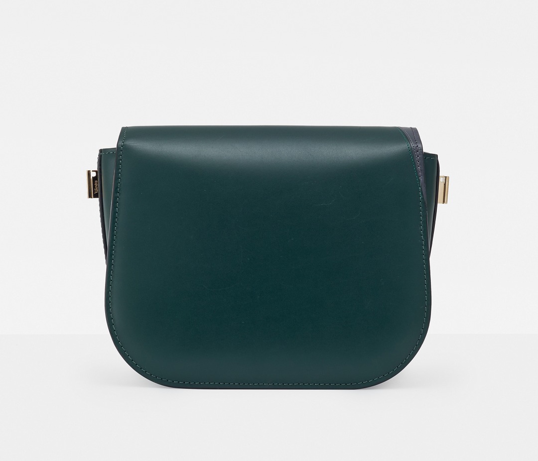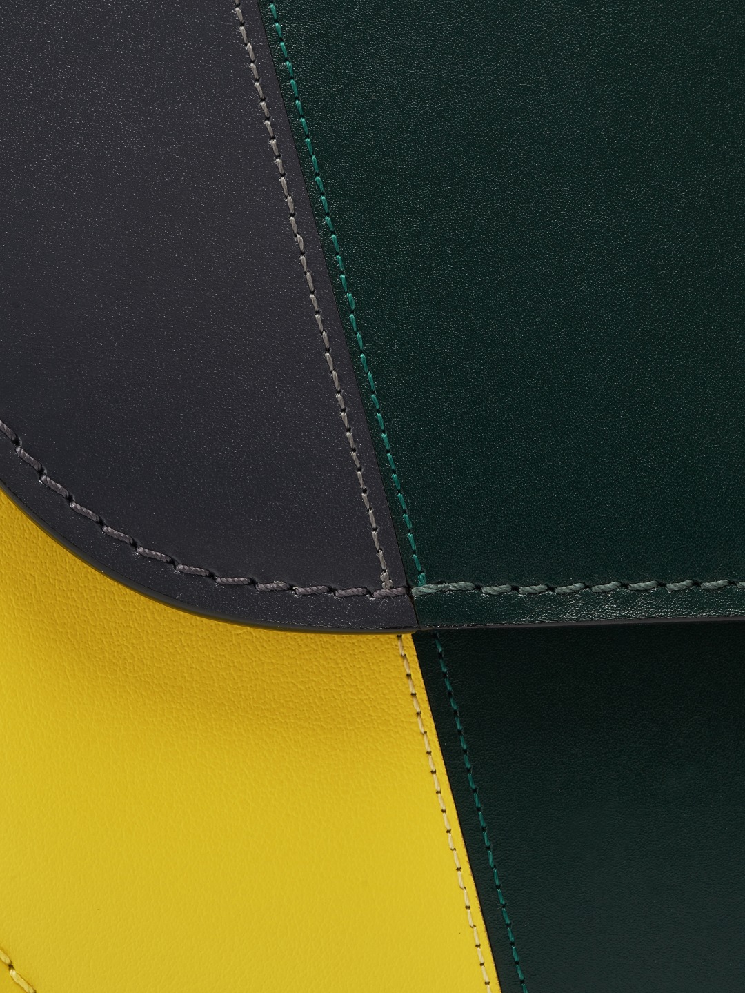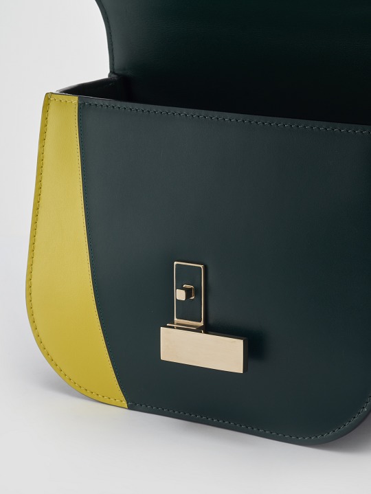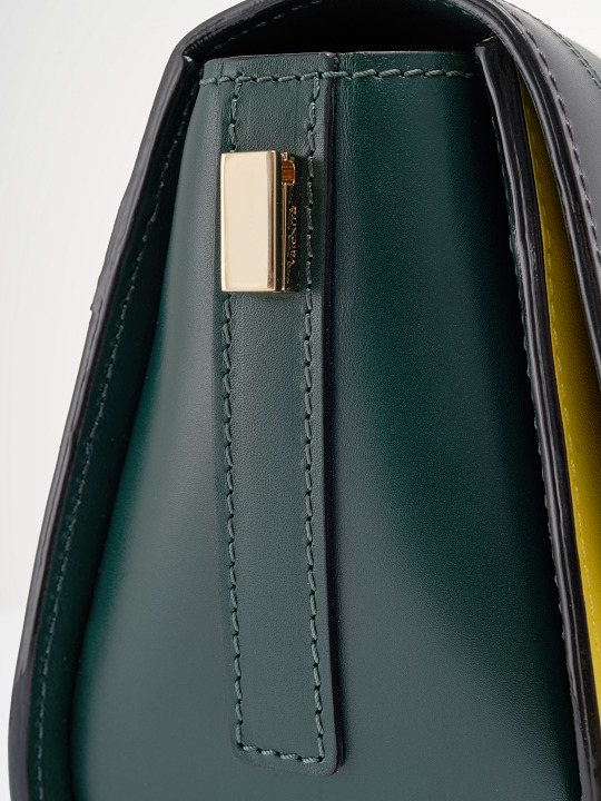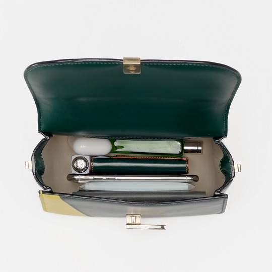 The color matching design of the bag is very exquisite. The bag body is based on low-saturation dark green , like a quiet and sleeping forest; the corner of the flap is spliced with navy blue details, as if looking at the night sky through the treetops; the lemon yellow is the gradually bright morning light.