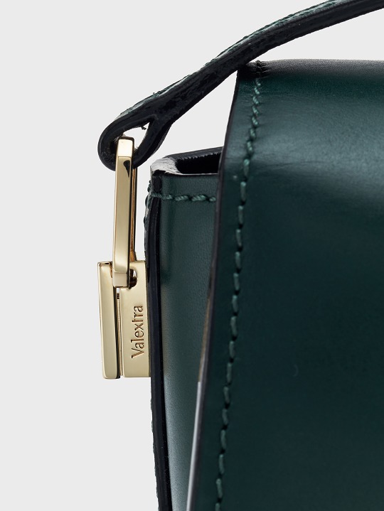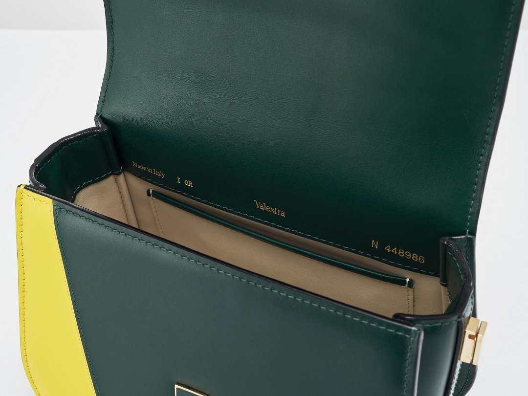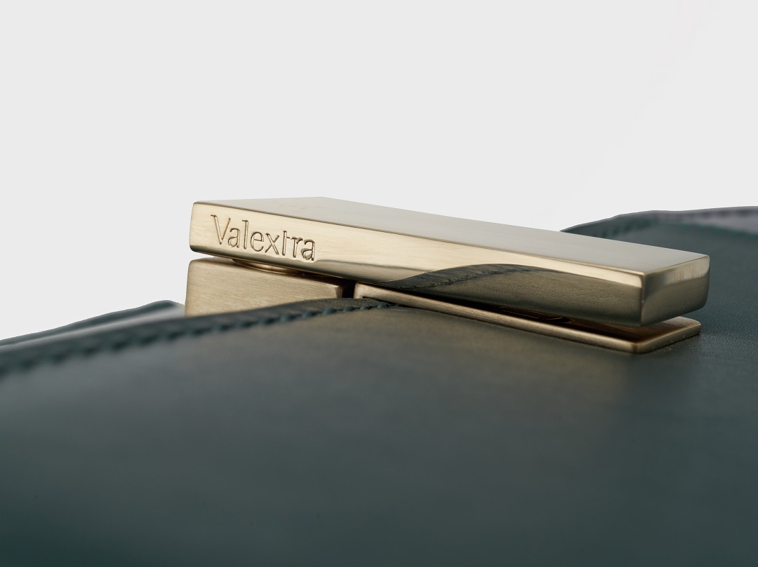 The Valextra brand logo is discreetly engraved on the side, and the inside is carefully inlaid with leather in the same color as the handbag.