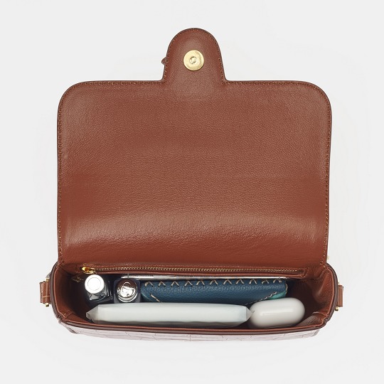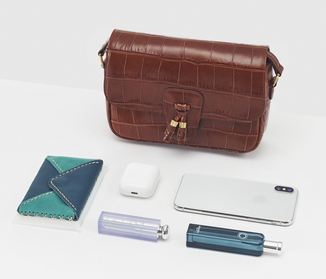 The single-layer large compartment design optimizes the bag's capacity and easily accommodates daily gear. We put an iPhone X, a card holder, a pack of tissues, a pair of Airpods, a lip gloss and a bottle of perfume in the bag.