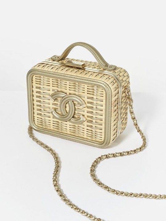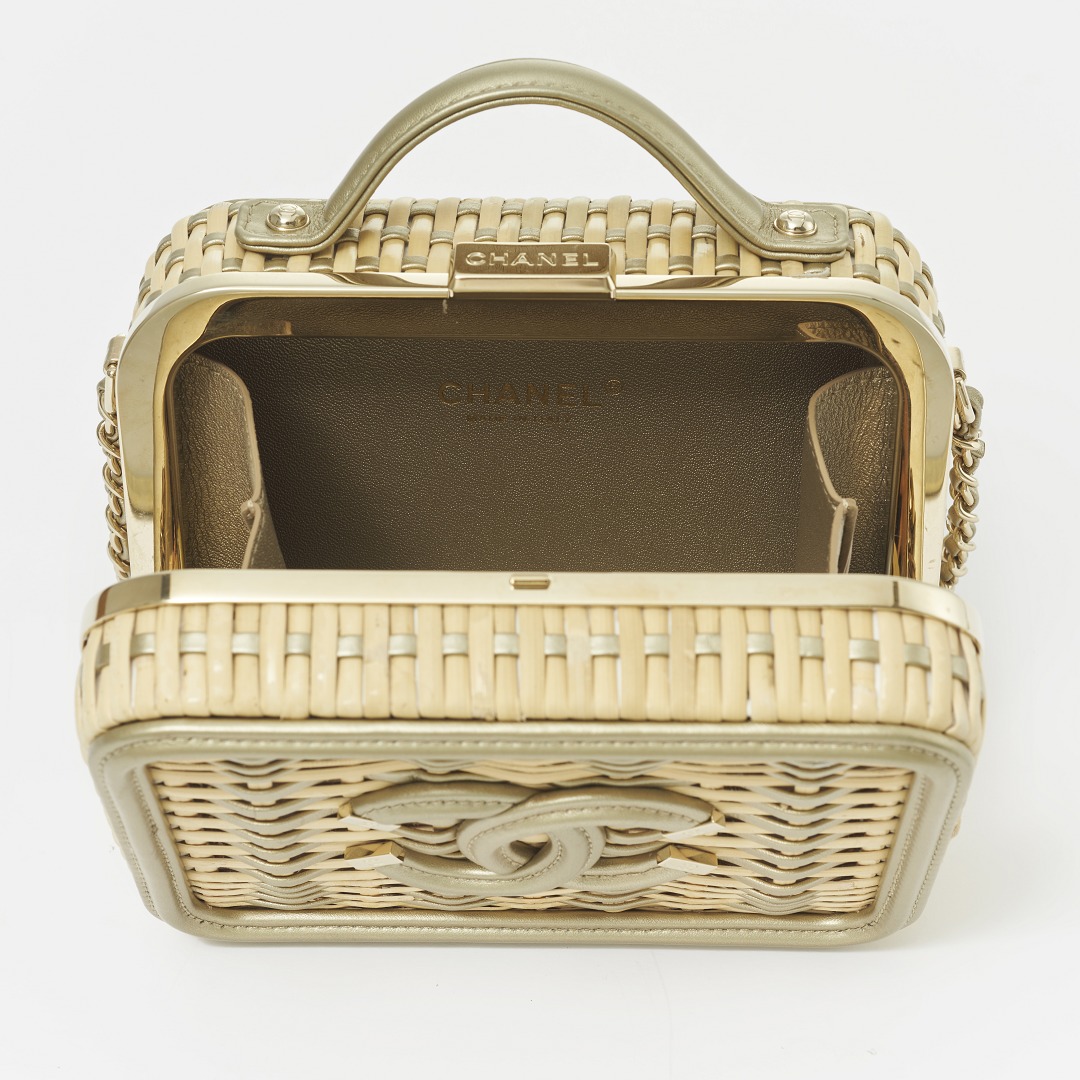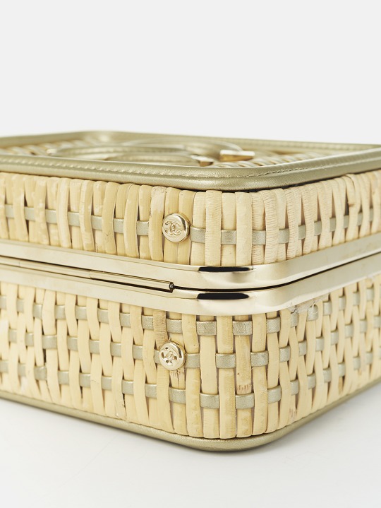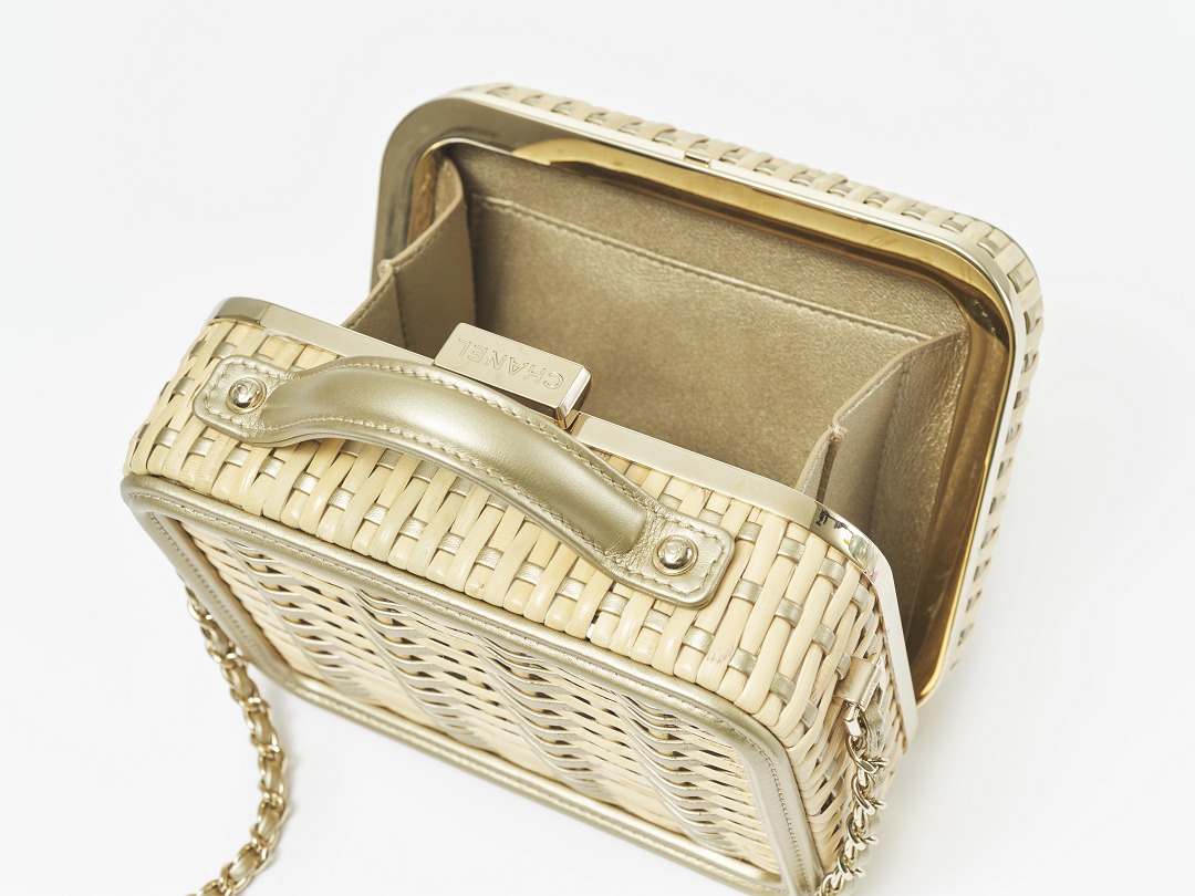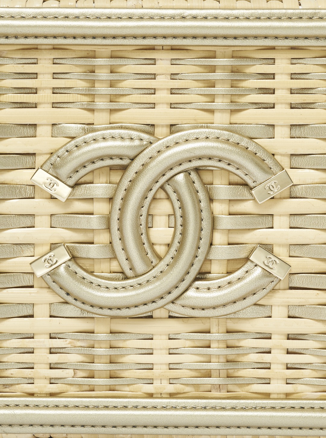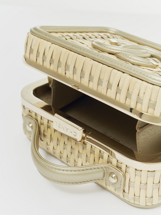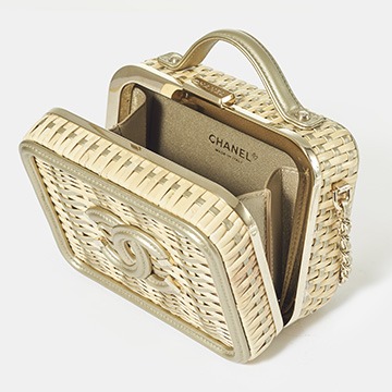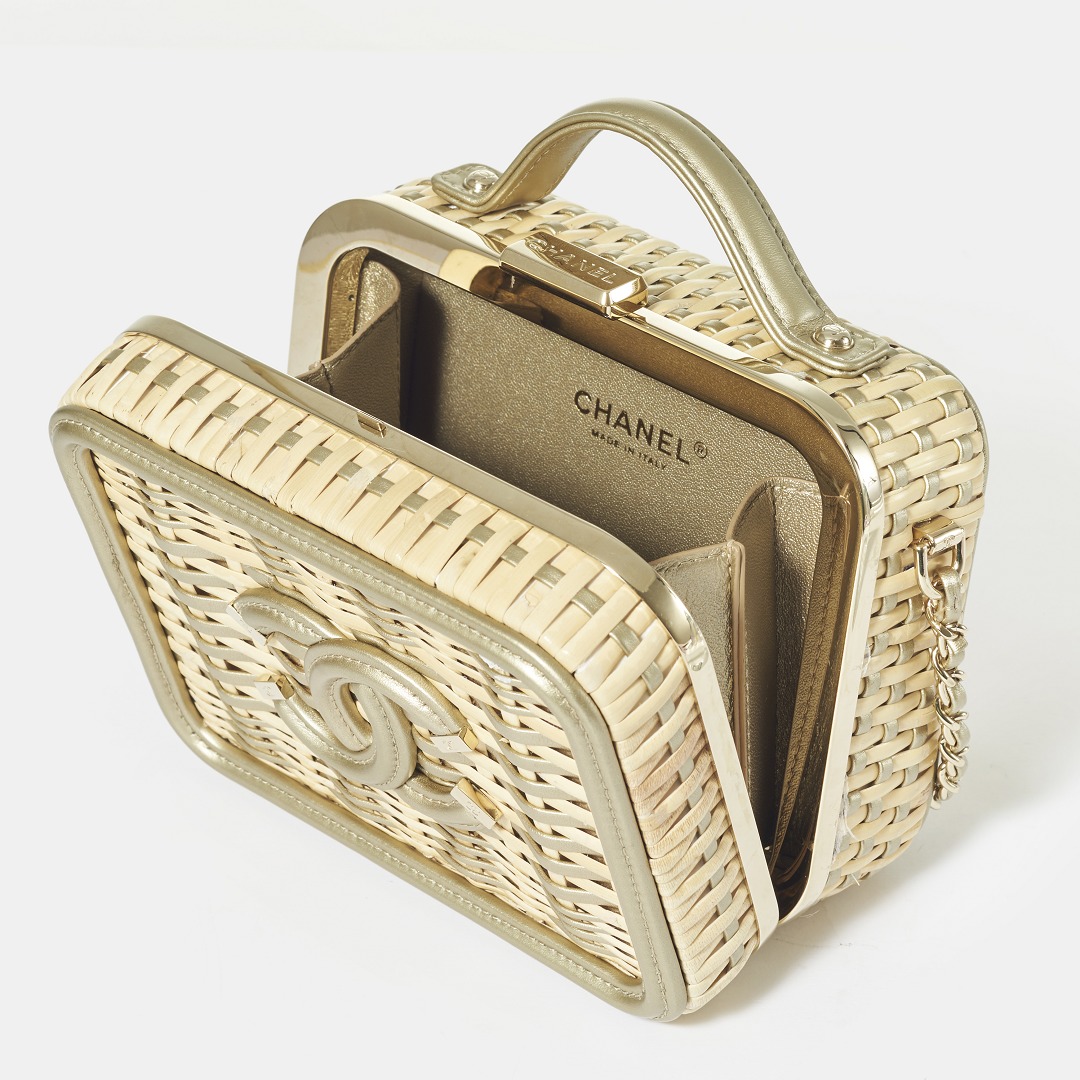 This rattan woven Vanity Case is from the CHANEL 2019 Spring/Summer collection. It is themed on beach vacation and is very cool and refreshing from the material to the color.