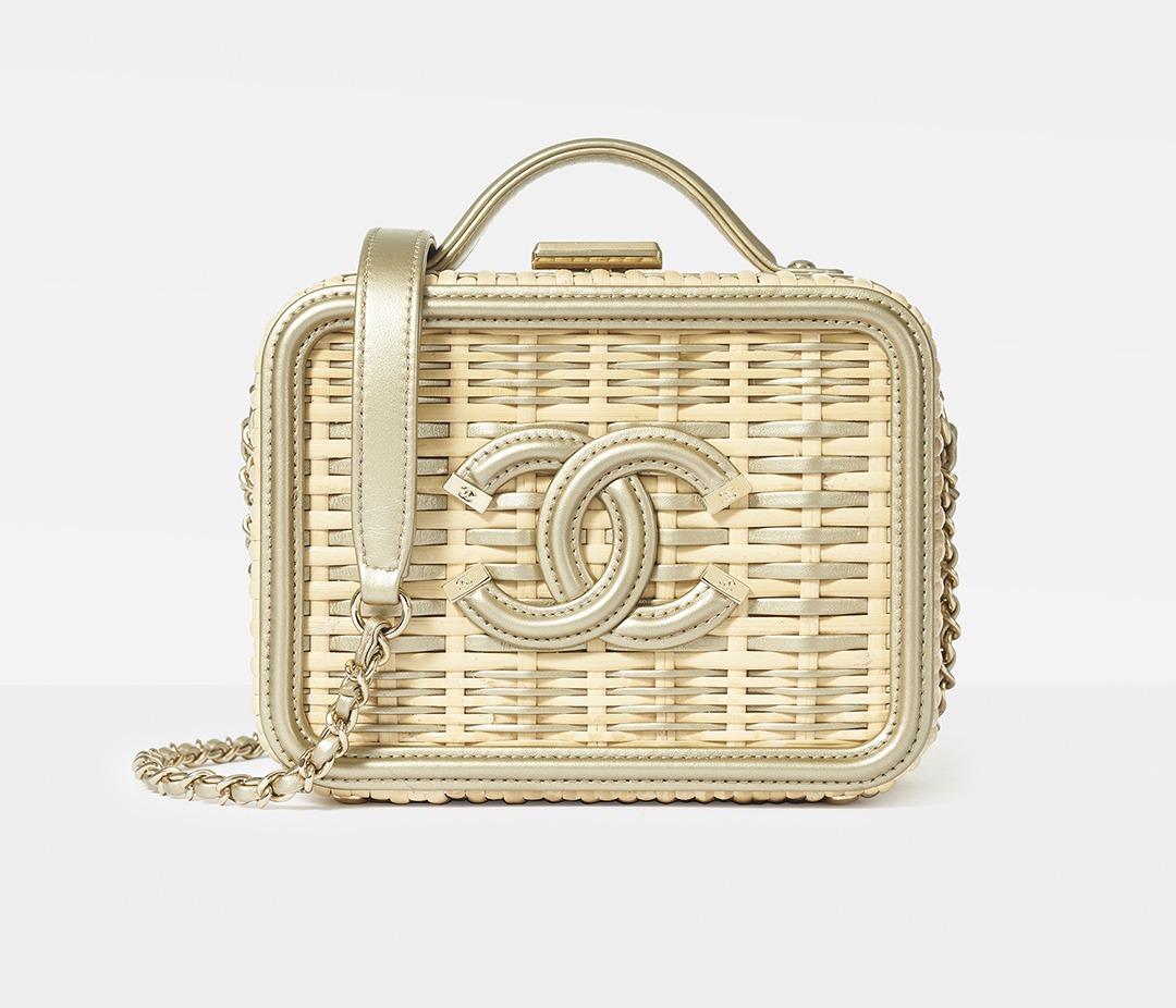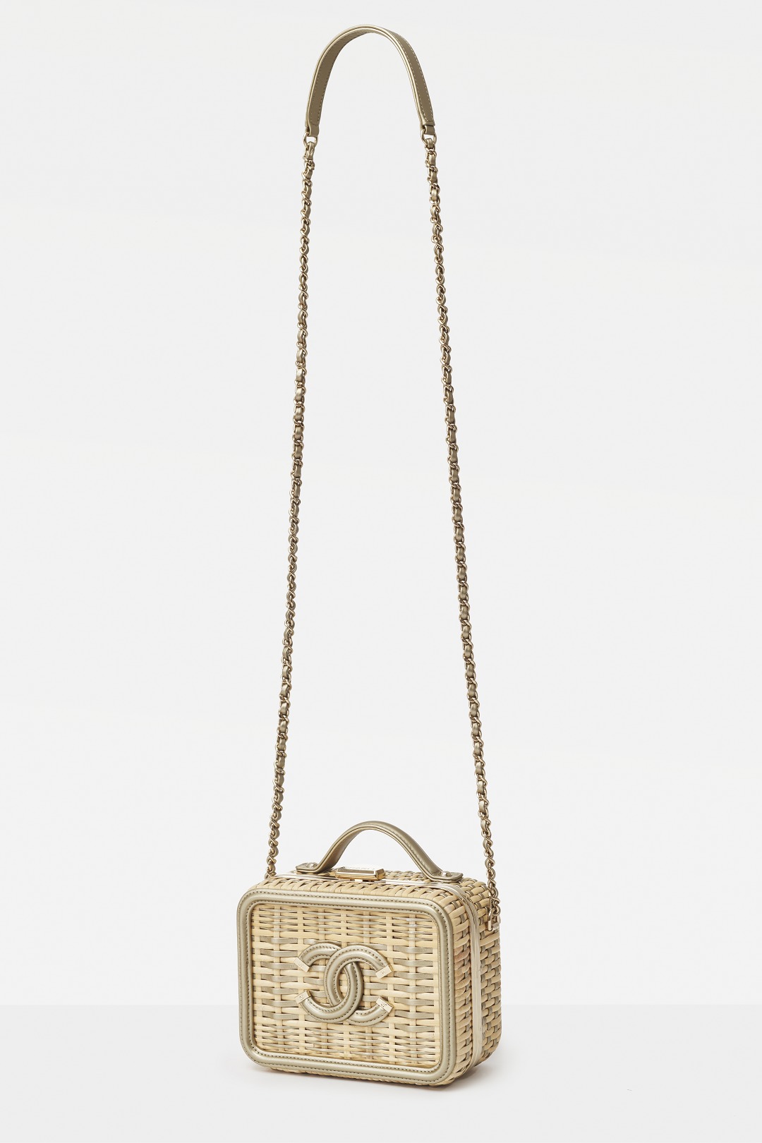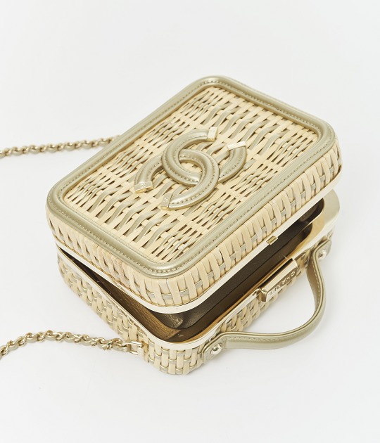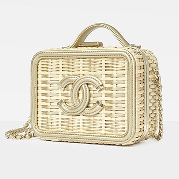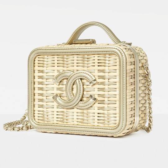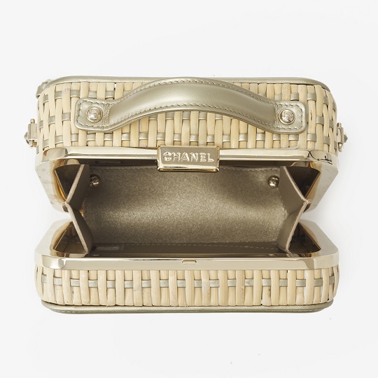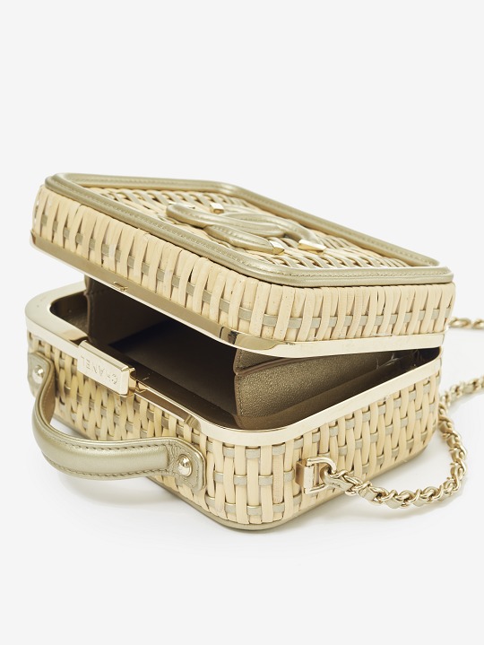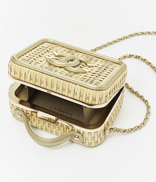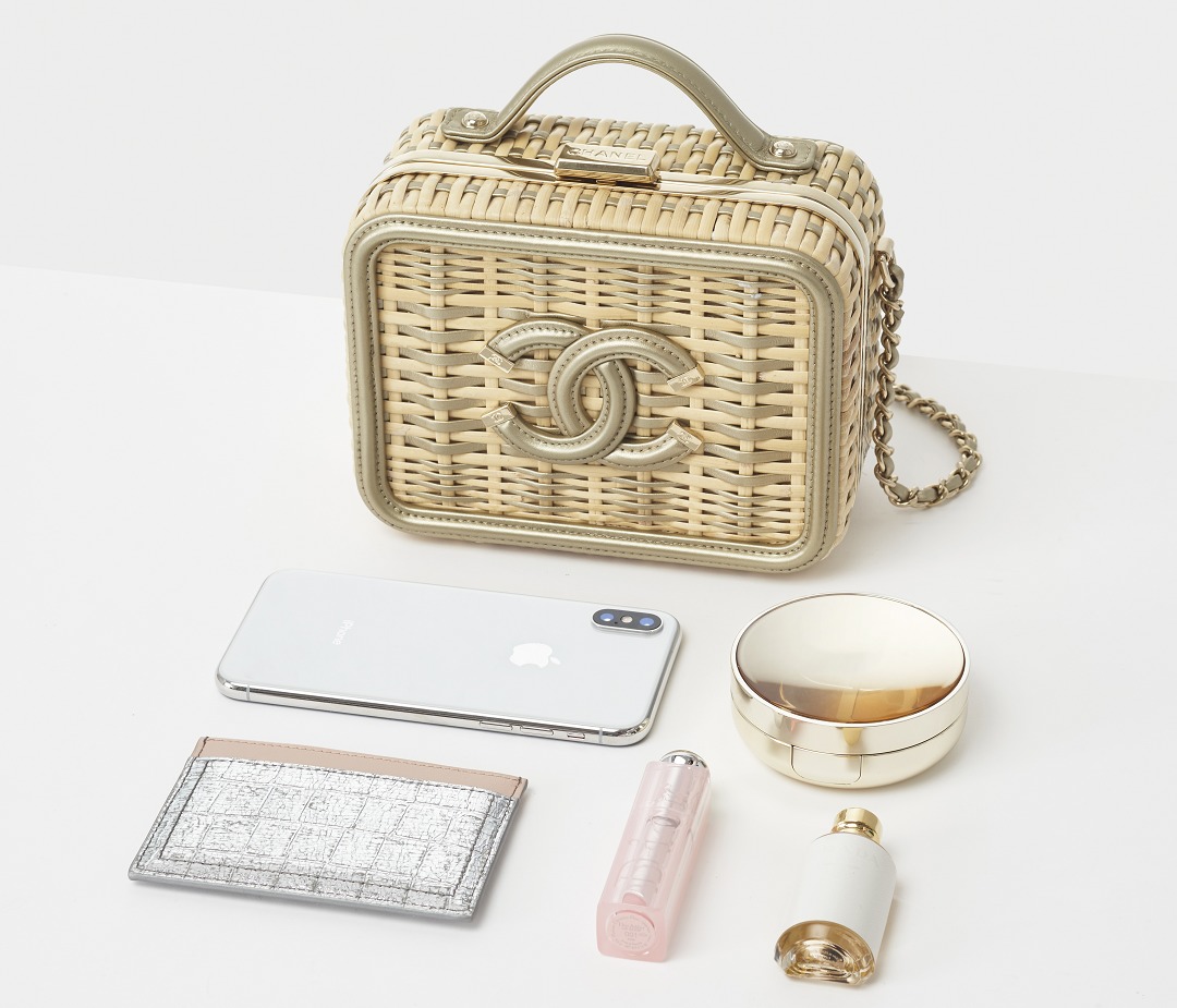 This rattan woven Vanity Case is from the CHANEL 2019 Spring/Summer collection. It is themed on beach vacation and is very cool and refreshing from the material to the color.