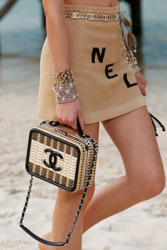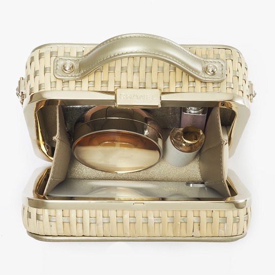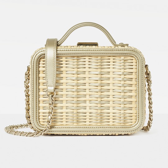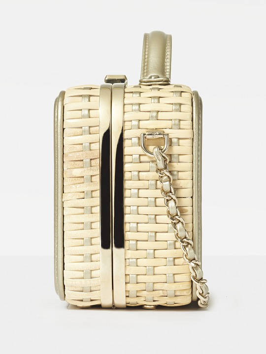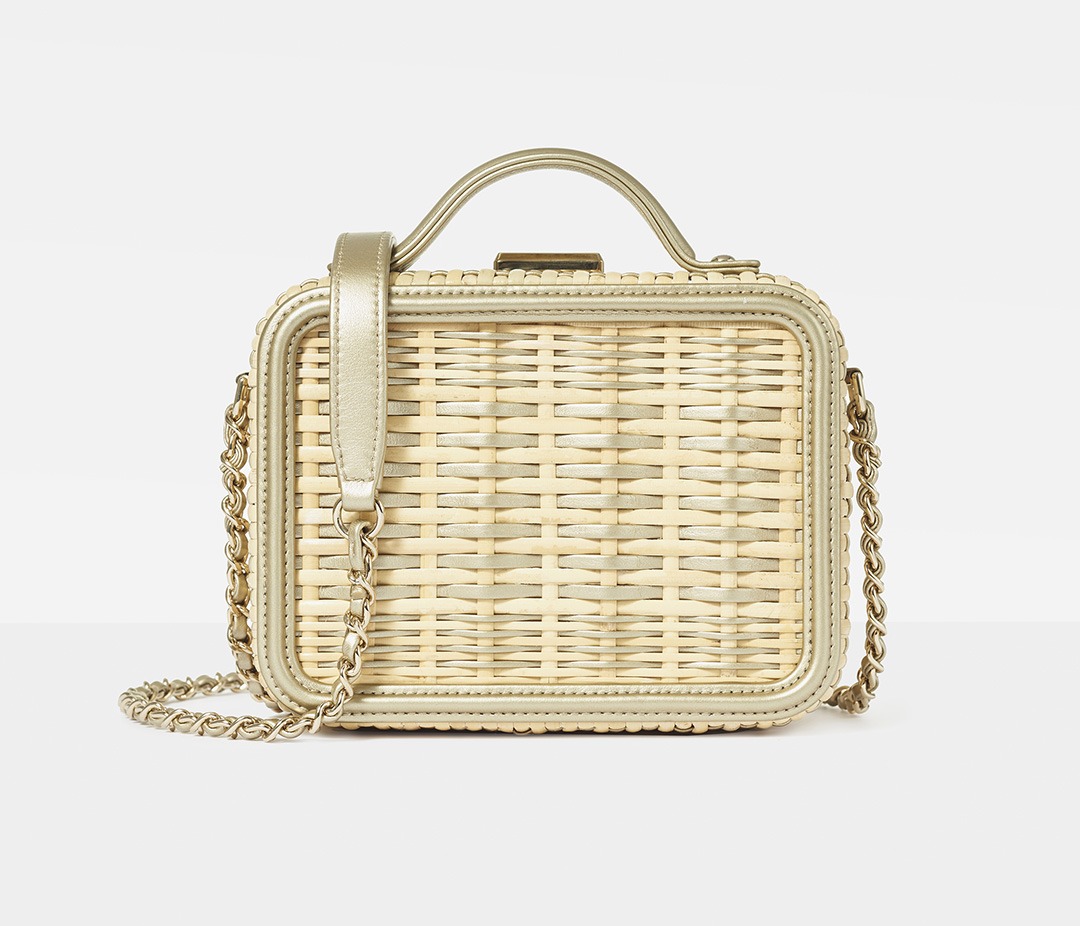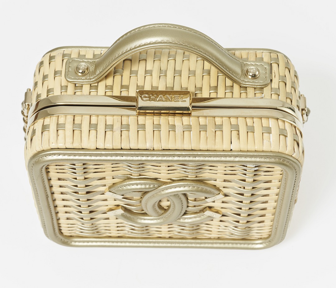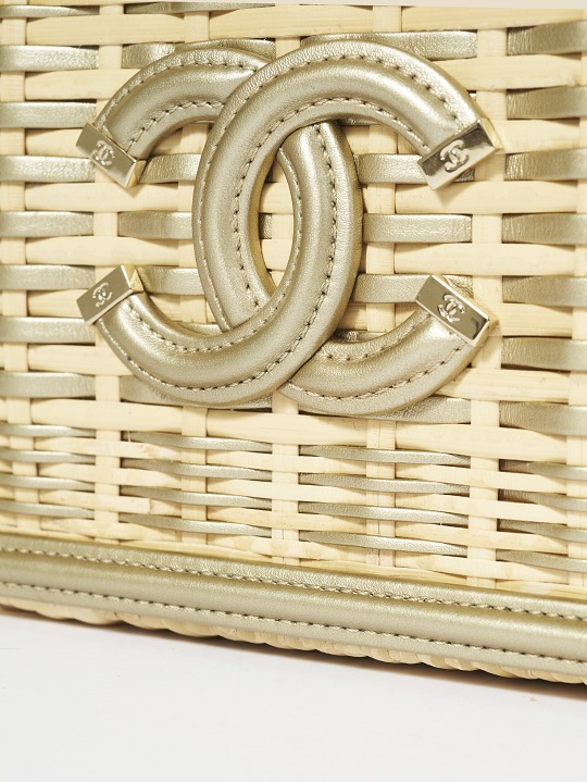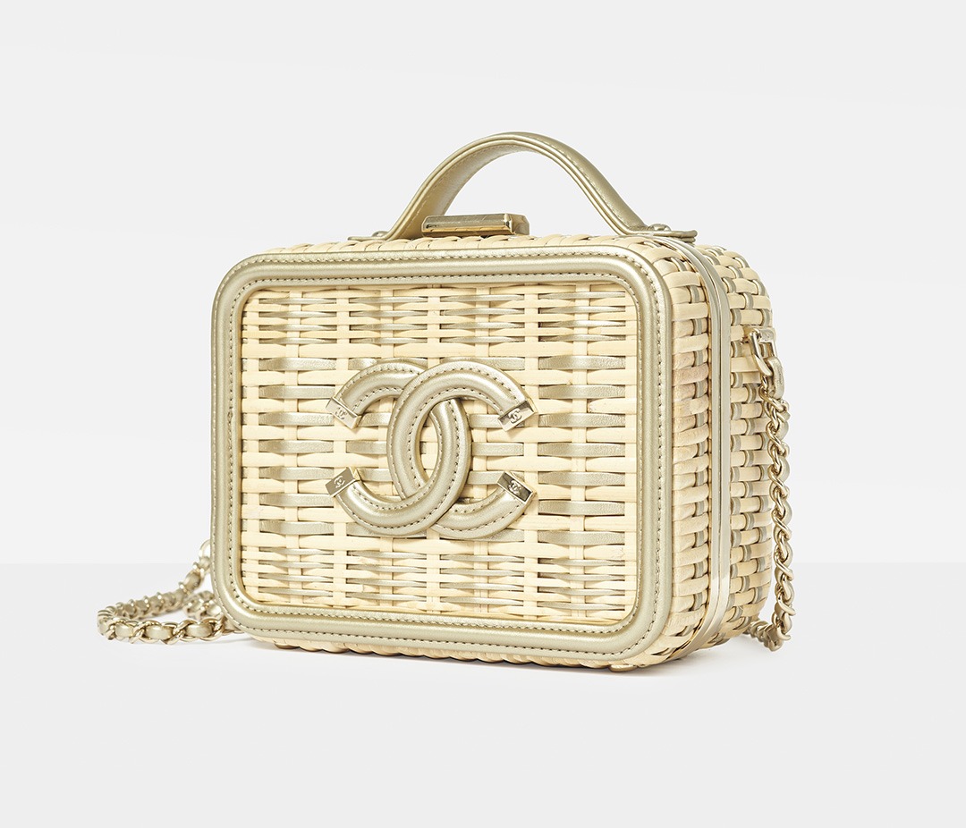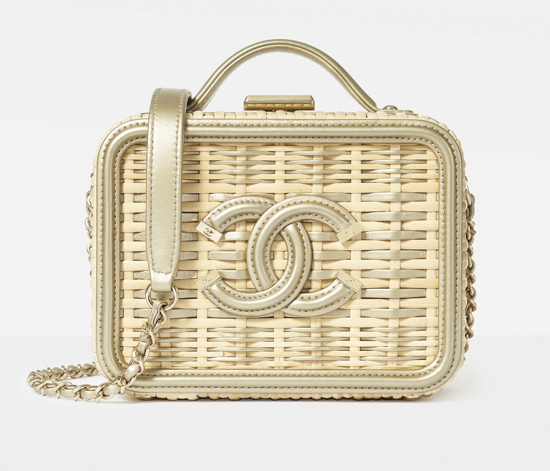 This rattan woven Vanity Case is from the CHANEL 2019 Spring/Summer collection. It is themed on beach vacation and is very cool and refreshing from the material to the color.