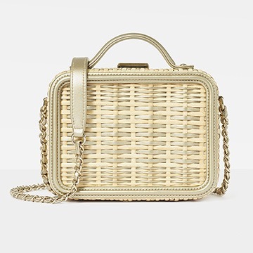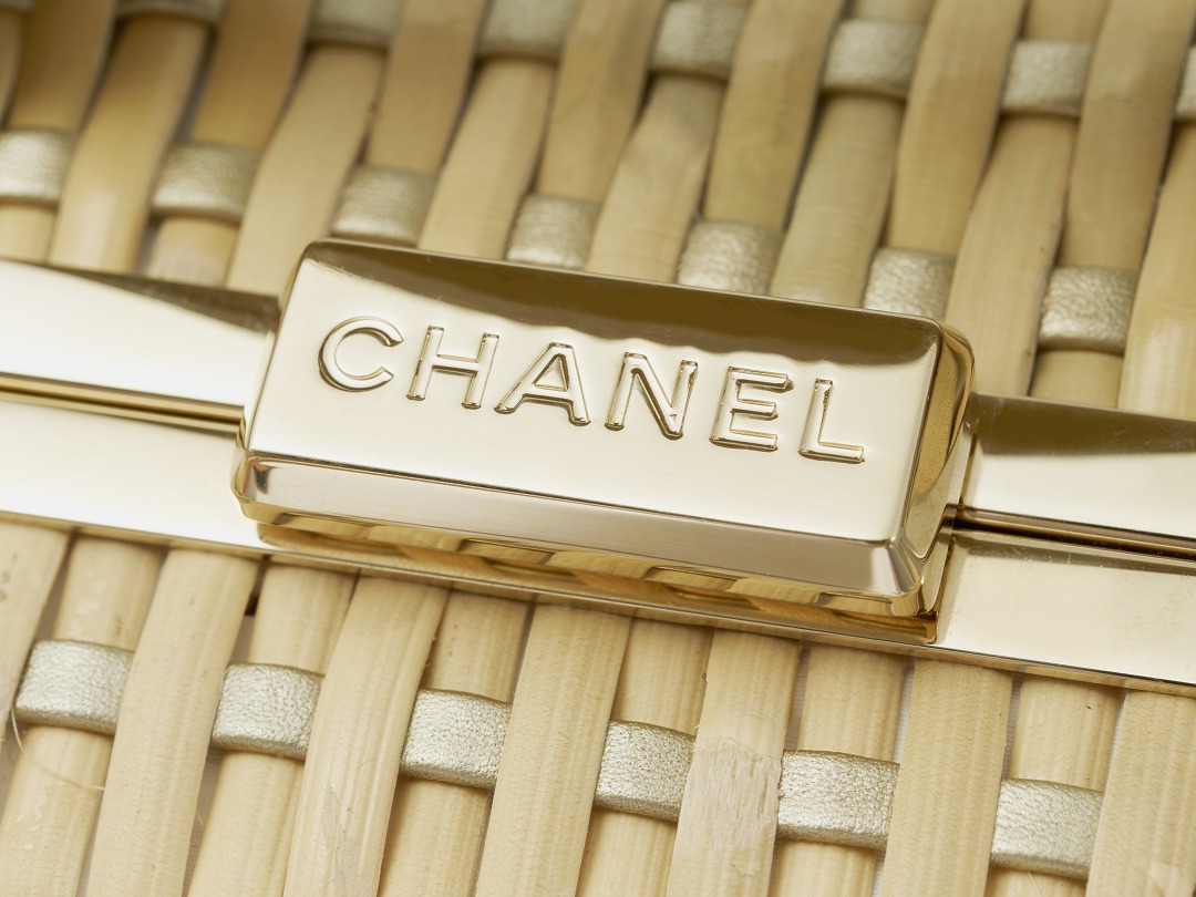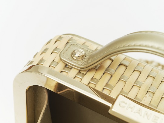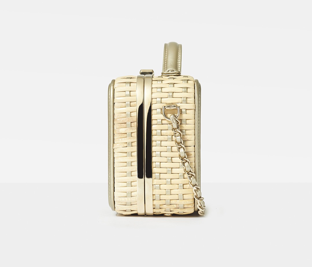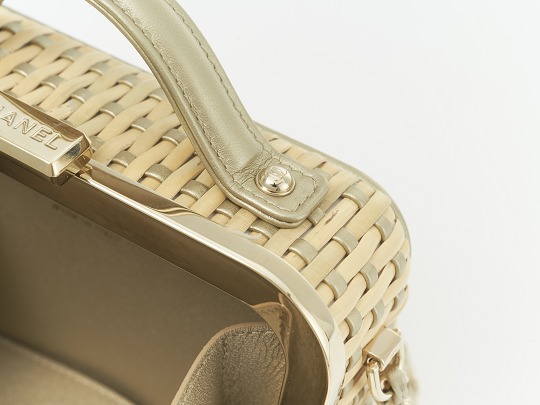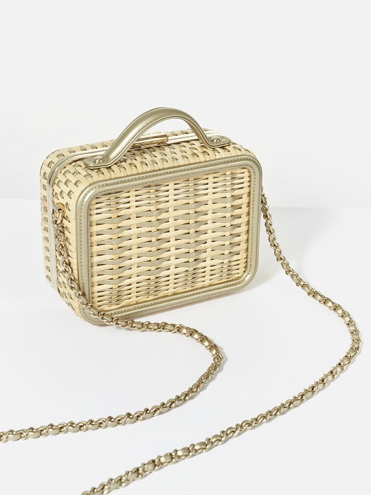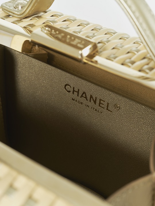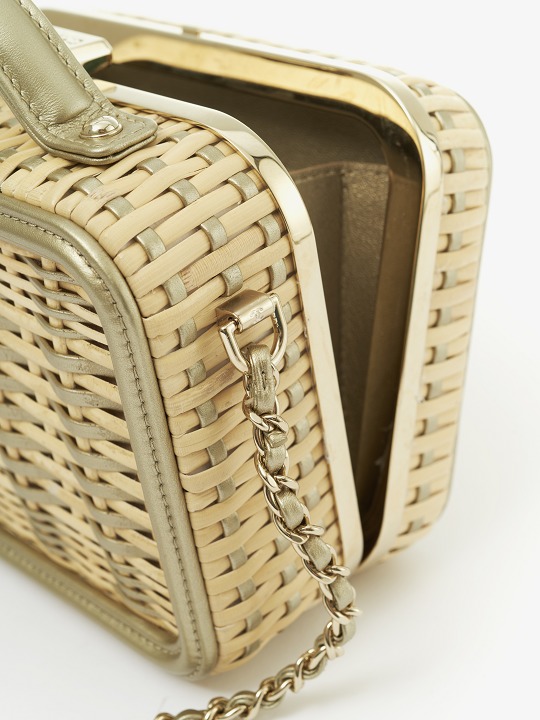 The main body of the bag is woven with rattan , using a warp and weft interlacing technique. The closer to the edge, the denser the rattan is. The horizontal intervals are interlaced with primary rattan and light gold calfskin-covered rattan, which is exquisite and high-end in texture.