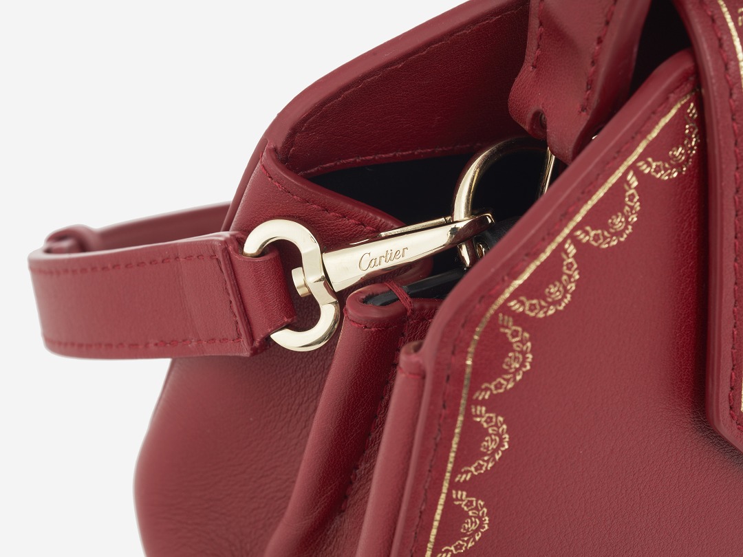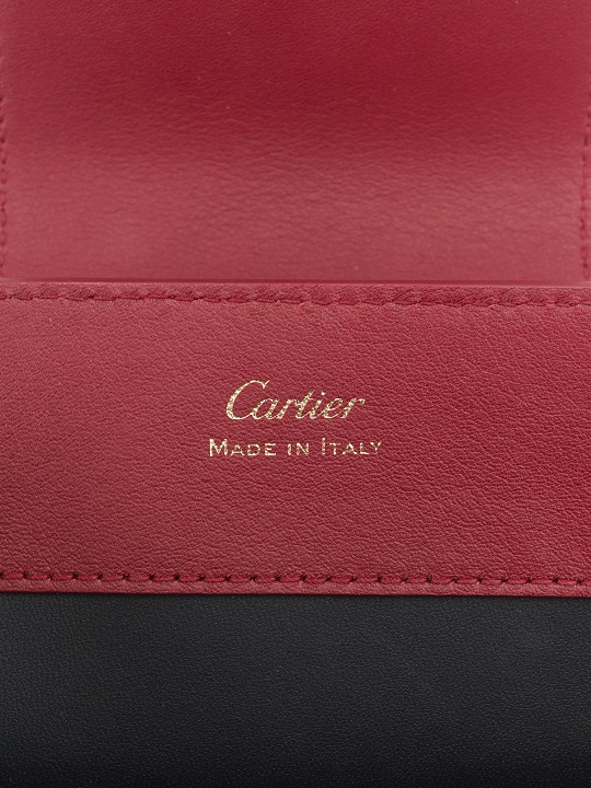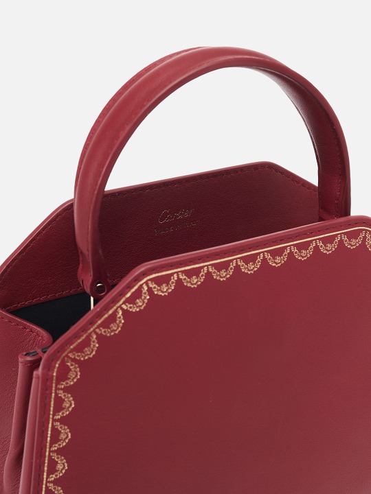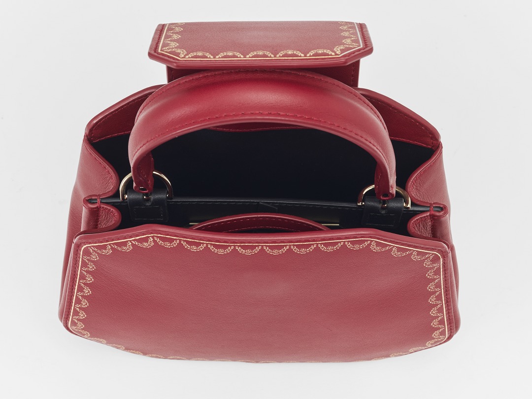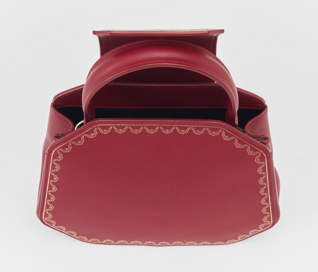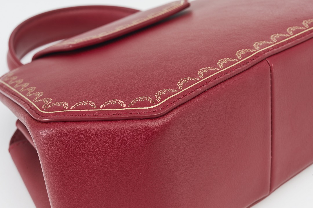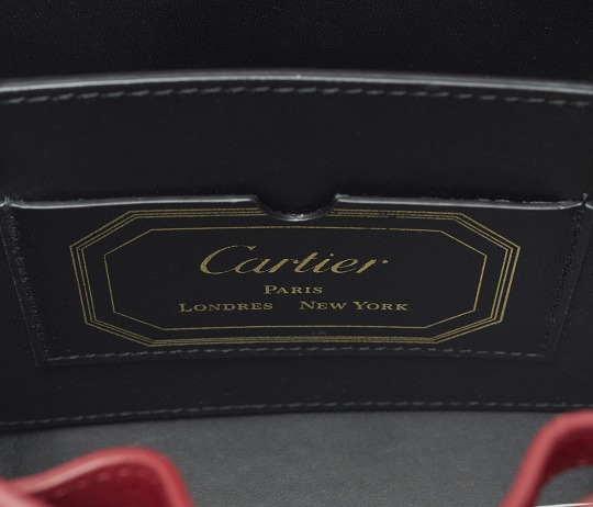 There is a clip pocket on the bag's partition with a makeup mirror inside . The front is engraved with the Cartier logo and the words Paris, Londres and New York, representing the flagship stores in Paris, London and New York where this handbag was first sold.