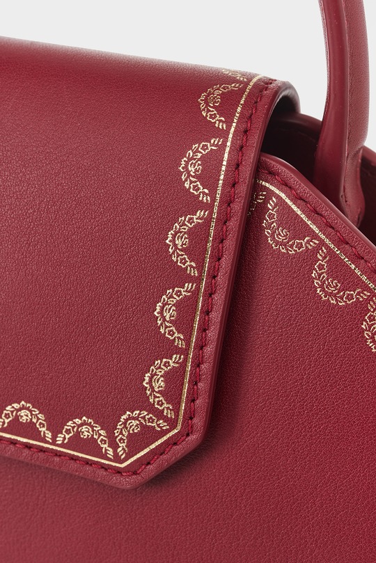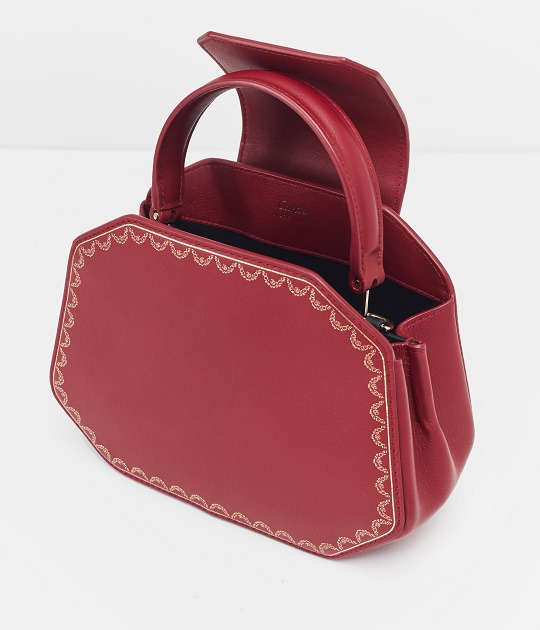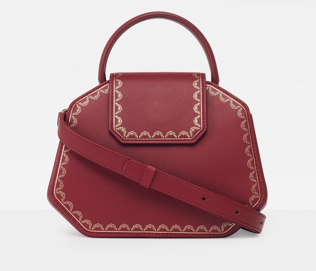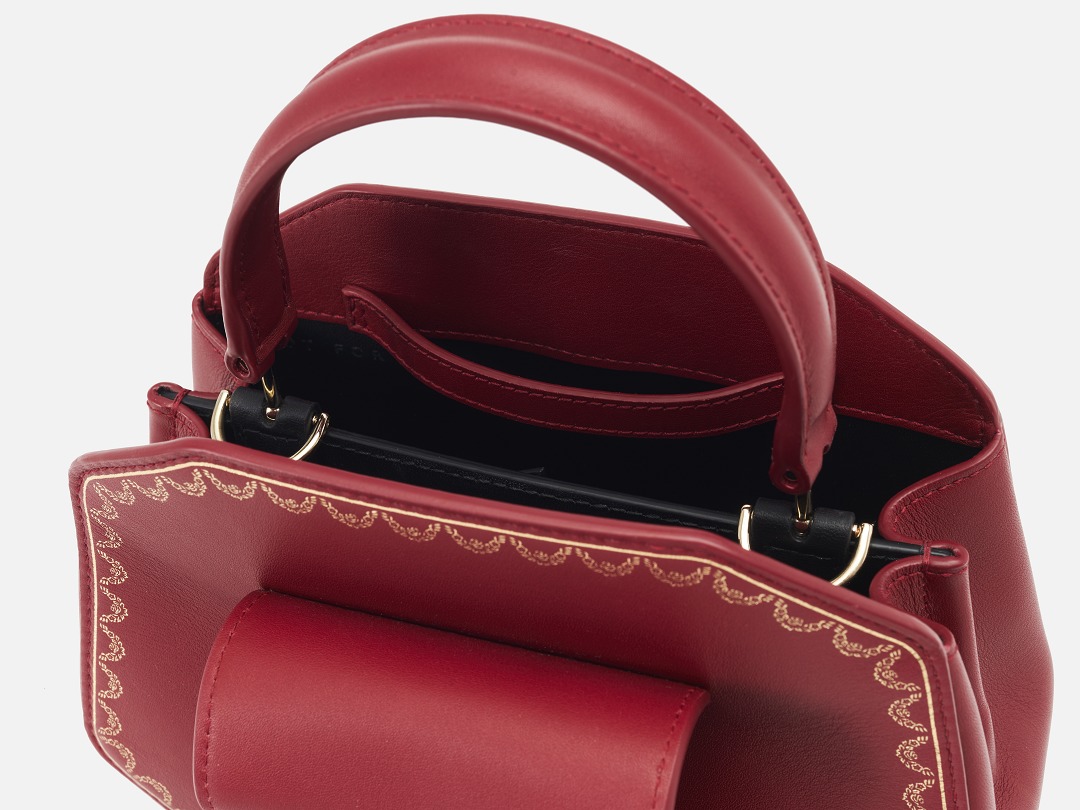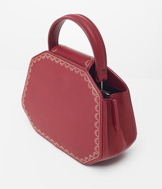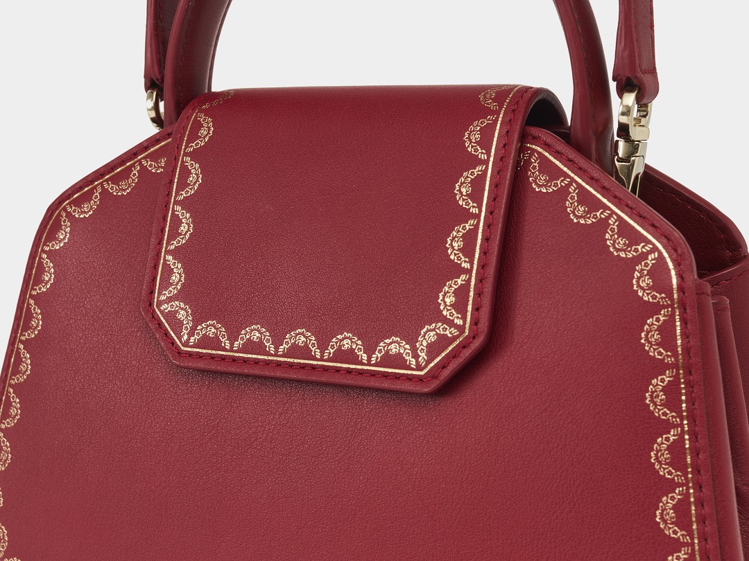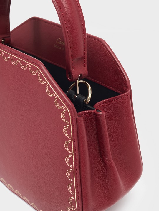There is a clip pocket on the bag's partition with a makeup mirror inside . The front is engraved with the Cartier logo and the words Paris, Londres and New York, representing the flagship stores in Paris, London and New York where this handbag was first sold.
