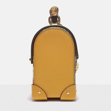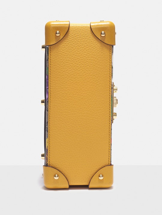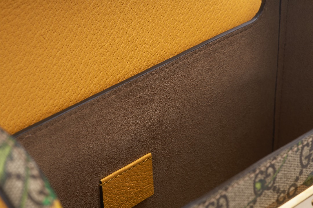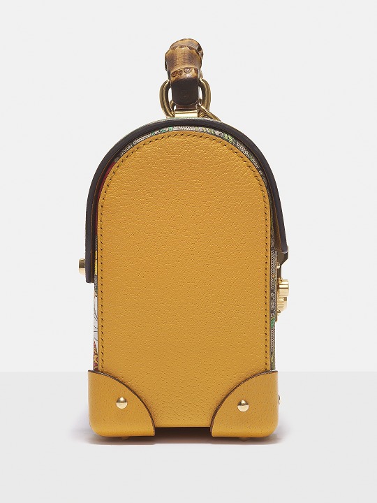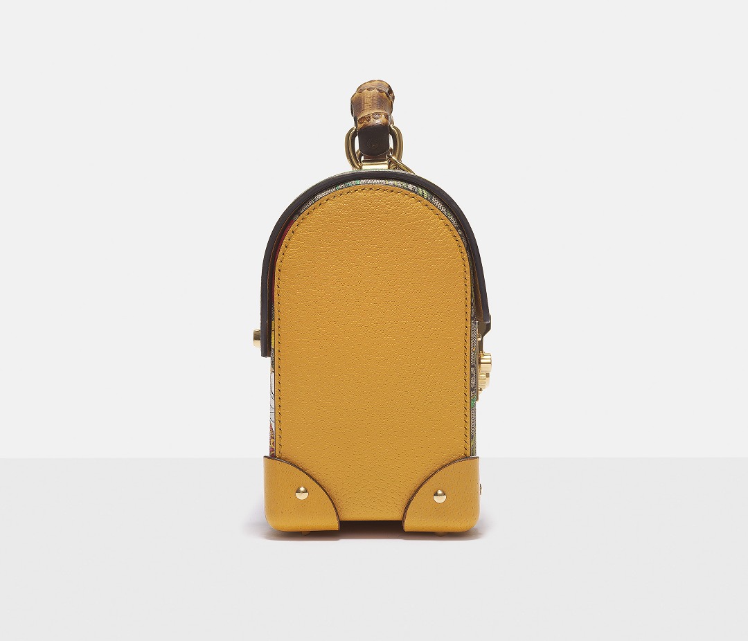 This bag continues the box-like structure, golden lock and leather corner elements of the vintage suitcase, and the top is changed to a rounded arch design, full of classical charm. The sides and bottom of the box are spliced with yellow leather, and the bright color exudes a fresh garden style.