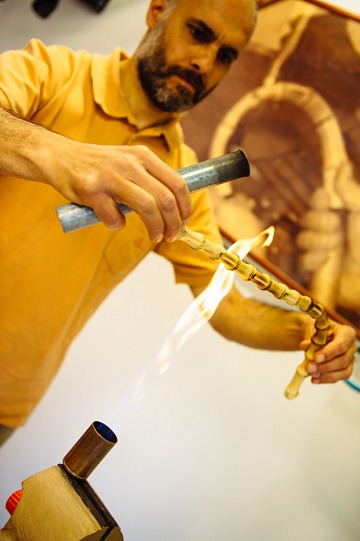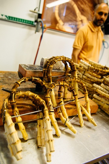 When making a bamboo handle, the bamboo is first bent and shaped by heating it over fire, then colored with natural beeswax and varnish, and then fired again to give it a natural scorch mark.