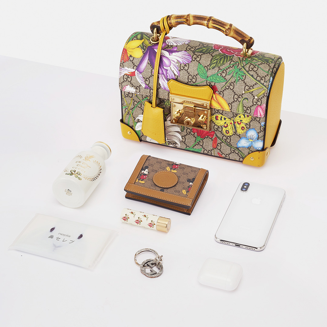 The interior is designed with an open large compartment , which is very spacious. We put a 100ml bottle of "Alchemist Garden" series perfume, a short wallet, two lipsticks and a pair of Airpods in the bag, which only takes up the bottom space, which is enough for daily use or short trips. The floral totem on the bag is very holiday-like, and it can also be used as a picnic box .