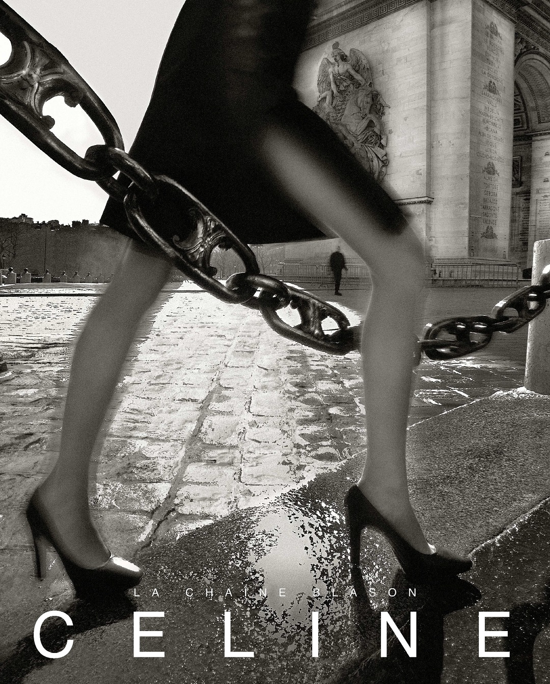 This is the first time CELINE has re-launched the monogram canvas in nearly 20 years . The word Triomphe means "triumph" in French , and it has a great connection with the Arc de Triomphe in Paris. In 1972, the brand's founder Celine Vipiana designed the classic Chaine Blason chain logo inspired by the chain in front of the Arc de Triomphe .