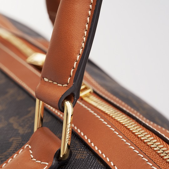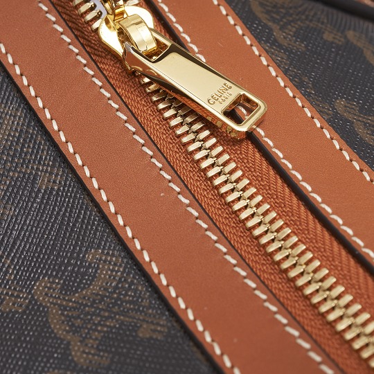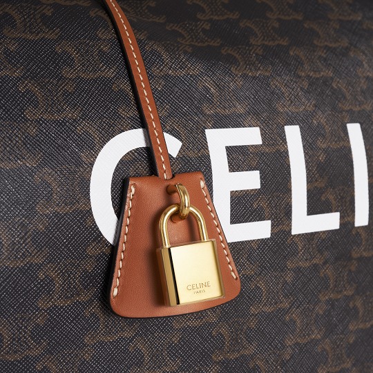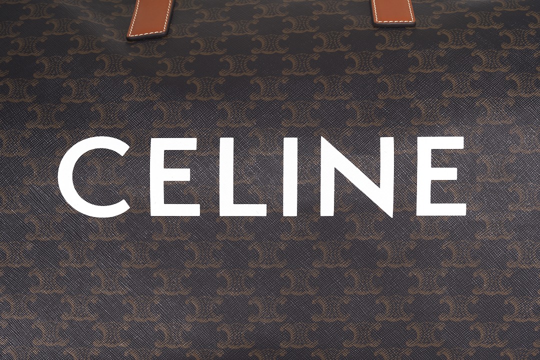 The white CELINE logo is hot-stamped on the front of the bag , which is eye-catching and recognizable. The handles, zippers, shoulder straps and the edges of the bag body are decorated with tan calfskin and outlined with open stitching. The addition of light colors reduces the heaviness of the large bag, and the leather piping also makes the bag more secure and durable.