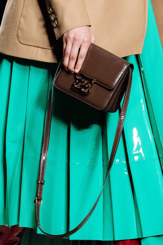 FENDI 2020 Early Spring LookbookFAB has taken the small square shape of the Karligraphy handbag and evolved the Karligraphy floral buckle into a square FF magnetic buckle. If the Karligraphy handbag has a retro charm, then the FAB is full of modern urban atmosphere. The appearance of the two bags is almost the same, both using a full and mini box bag shape, and a metal buckle in the center of the T-shaped flap.
