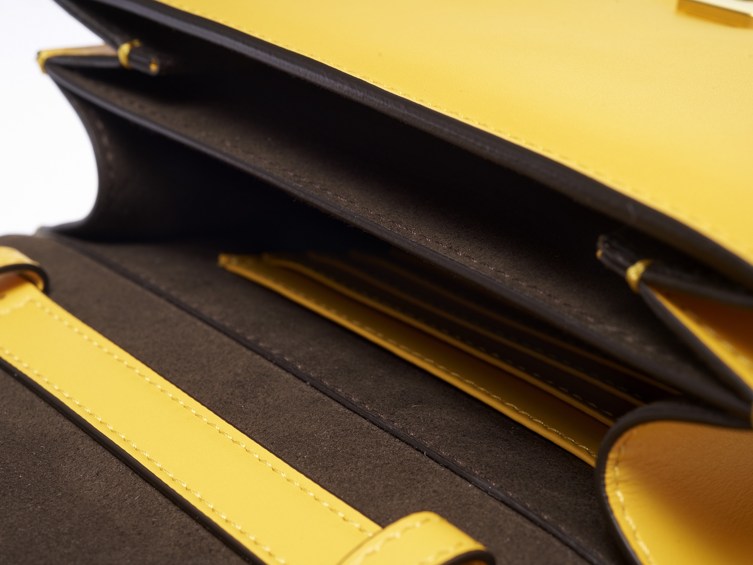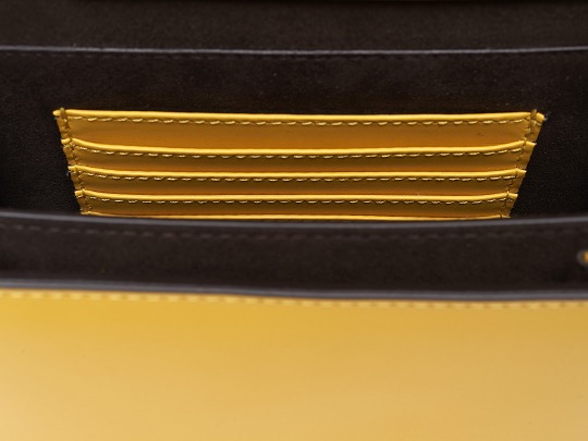 The lining is made of dark brown Alcantara textile fabric, which is a kind of artificial leather similar to suede, but it is much lighter than genuine leather and has the advantages of durability and wear resistance. There are 2 compartments inside, one side is stitched with a leather logo plate, and the other side is decorated with multiple yellow leather card slots for convenient storage of credit cards or documents.