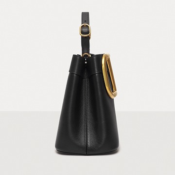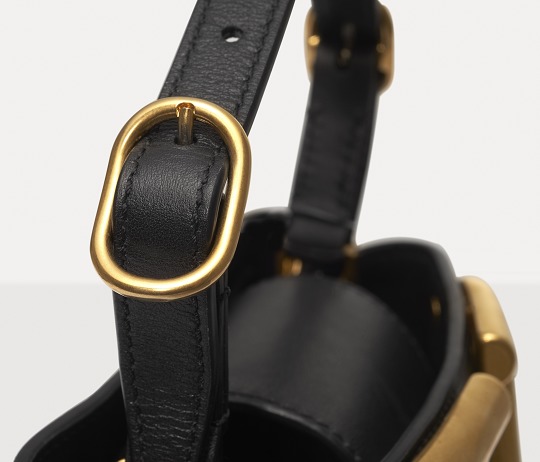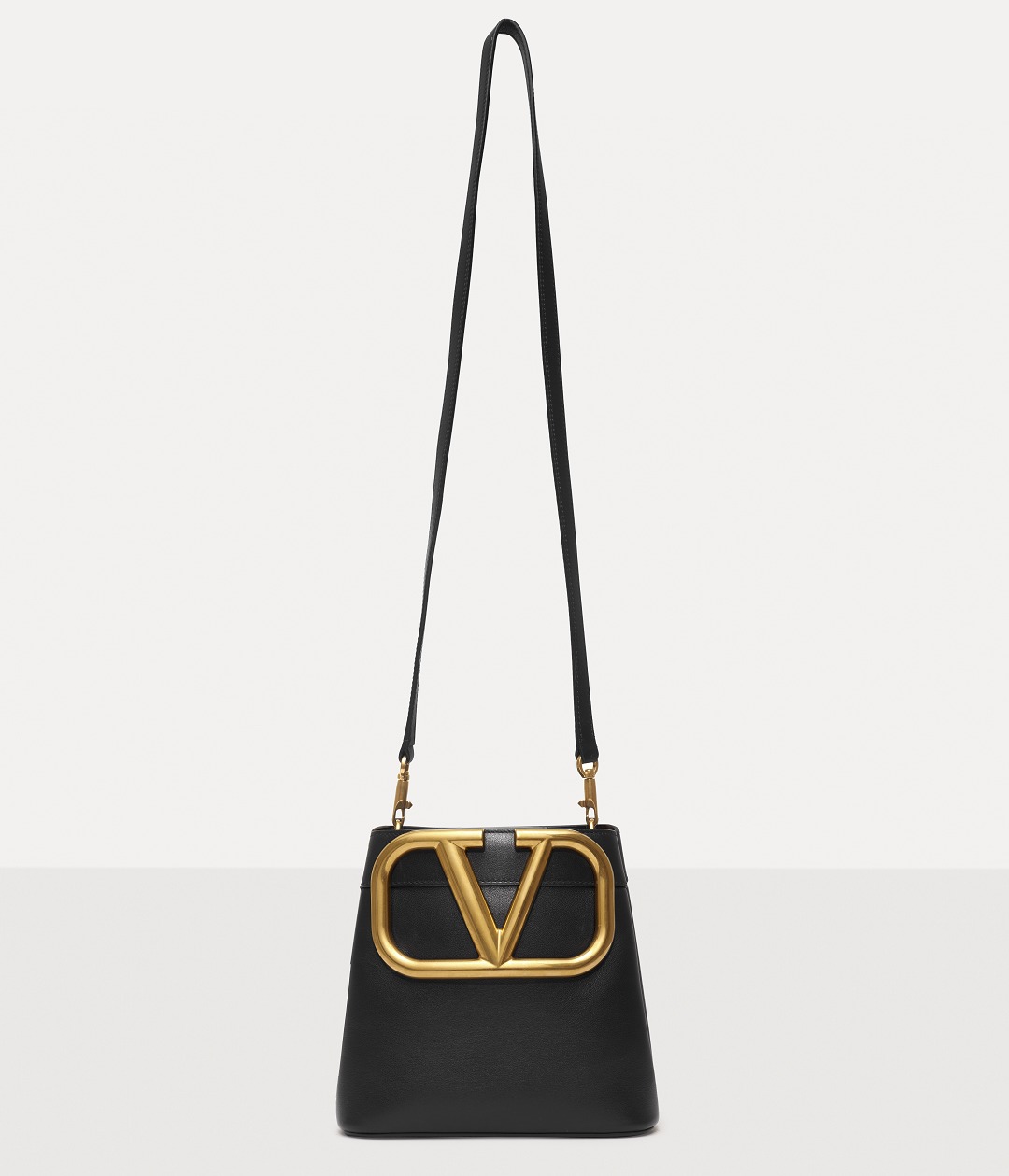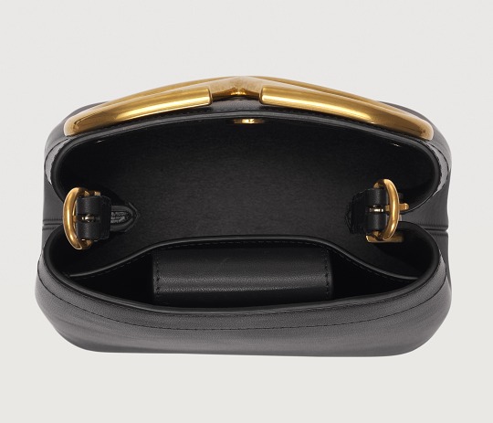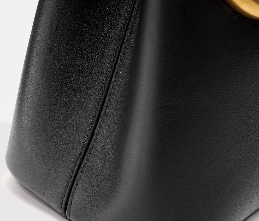 Made of glossy black calfskin , outlined with black stitching and oiled edges , the all-black bag sets off the shining gold VLOGO.