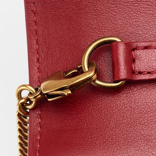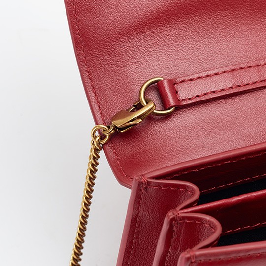 The bag's shoulder strap is a retro copper chain that echoes the metal buckle on the front. The dazzling gold and passionate red complement each other, creating a festive atmosphere.