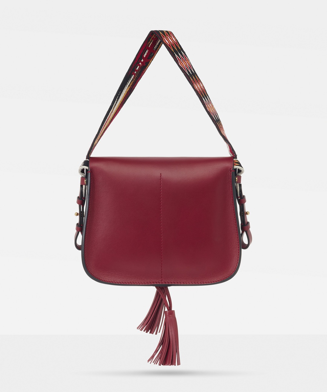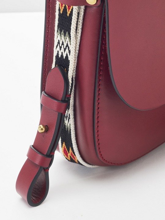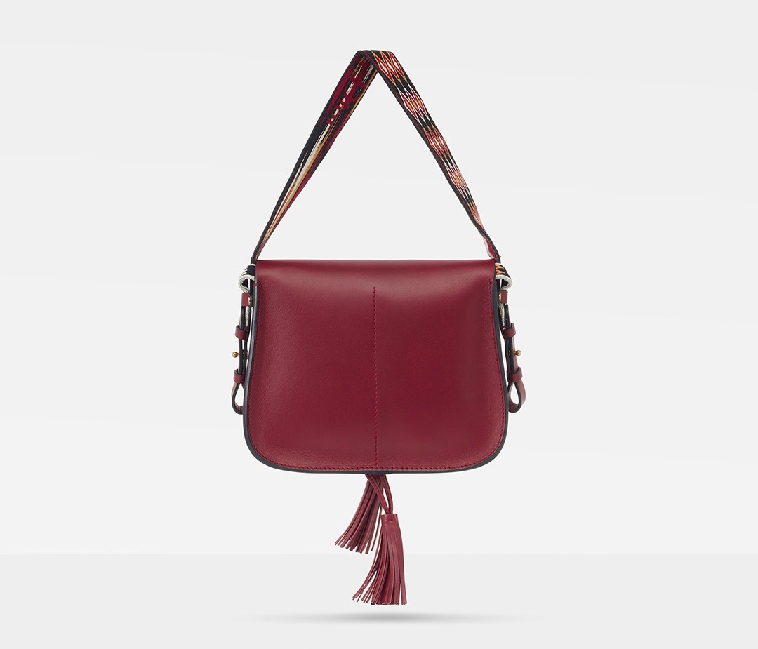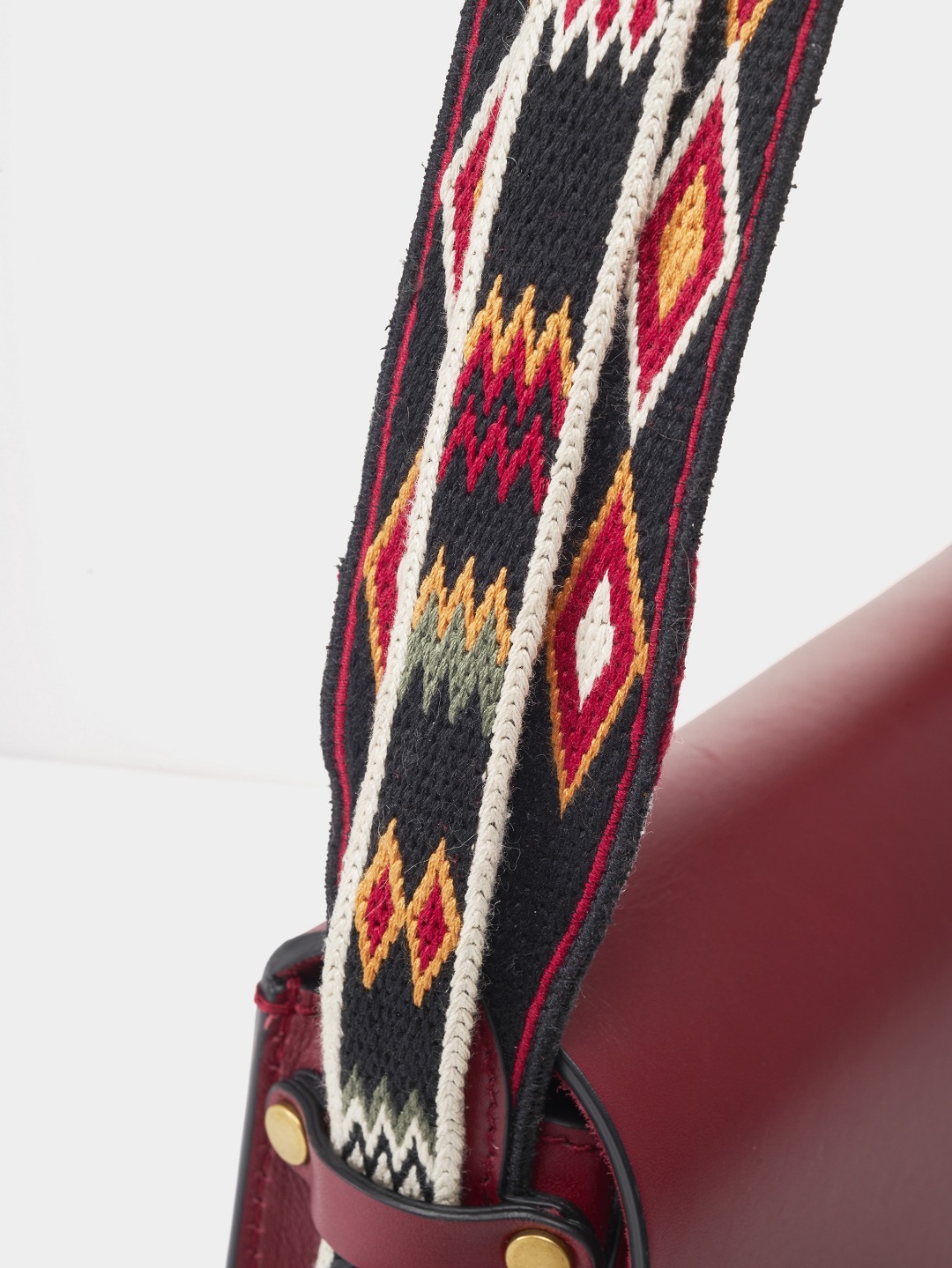 The long shoulder strap extends all the way to the bottom of the bag and is fastened with golden round nails at intervals, making the bag look exotic from every angle.