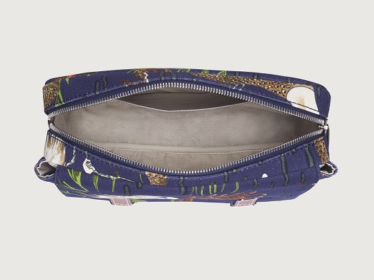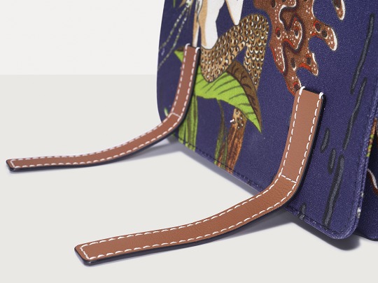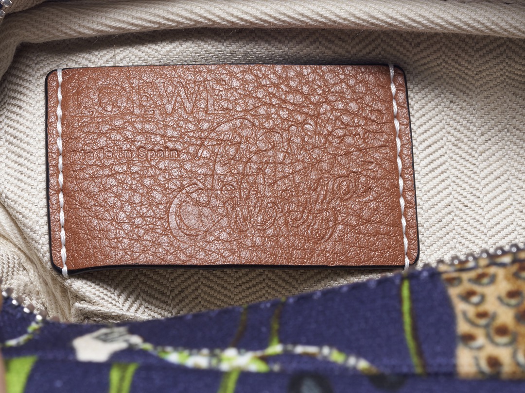 The bag is lined with cotton canvas and has an embossed leather interior with the Paula's X LOEWE logo. In addition to the front flap pocket, there is also a flat pocket inside to store small items.