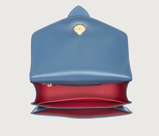 The bag has a crisp rounded rectangular outline, an envelope-style flap with a hint of retro, and a leather ribbon running through the center , like the cover of a classic book. The entire bag, including the lining, is made of glossy and finely polished cowhide . The saturation of the storm blue is not too high, exuding an elegant and fresh temperament.