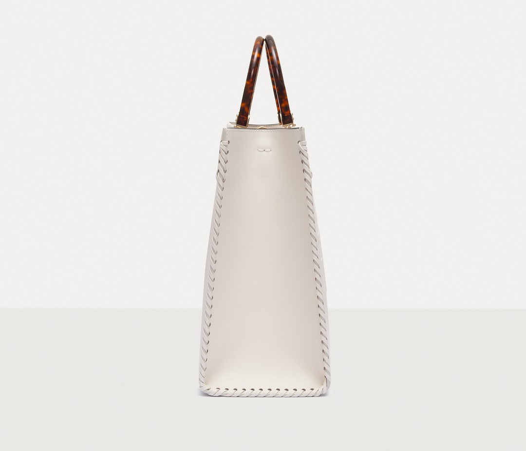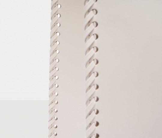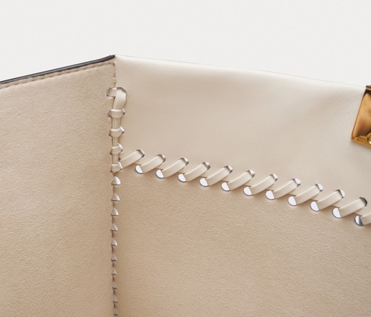 The designer first perforated the edges and details of the bag , and then threaded calfskin trims through the holes in an orderly manner like embroidery , which not only highlights the outline of the bag, but also injects a bit of western cowboy style into the minimalist bag.