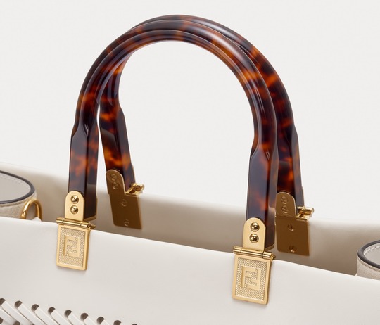 Detailed design is still the focus - the "U"-shaped double handles are made of tortoise-effect plexiglass , and the mottled dark brown translucent texture gives people a deep and classic feeling; the connection between the handles and the bag body is made of rectangular metal , embellished with FF Logo carvings. The hinge design allows the double handles to hang naturally at 180 degrees.