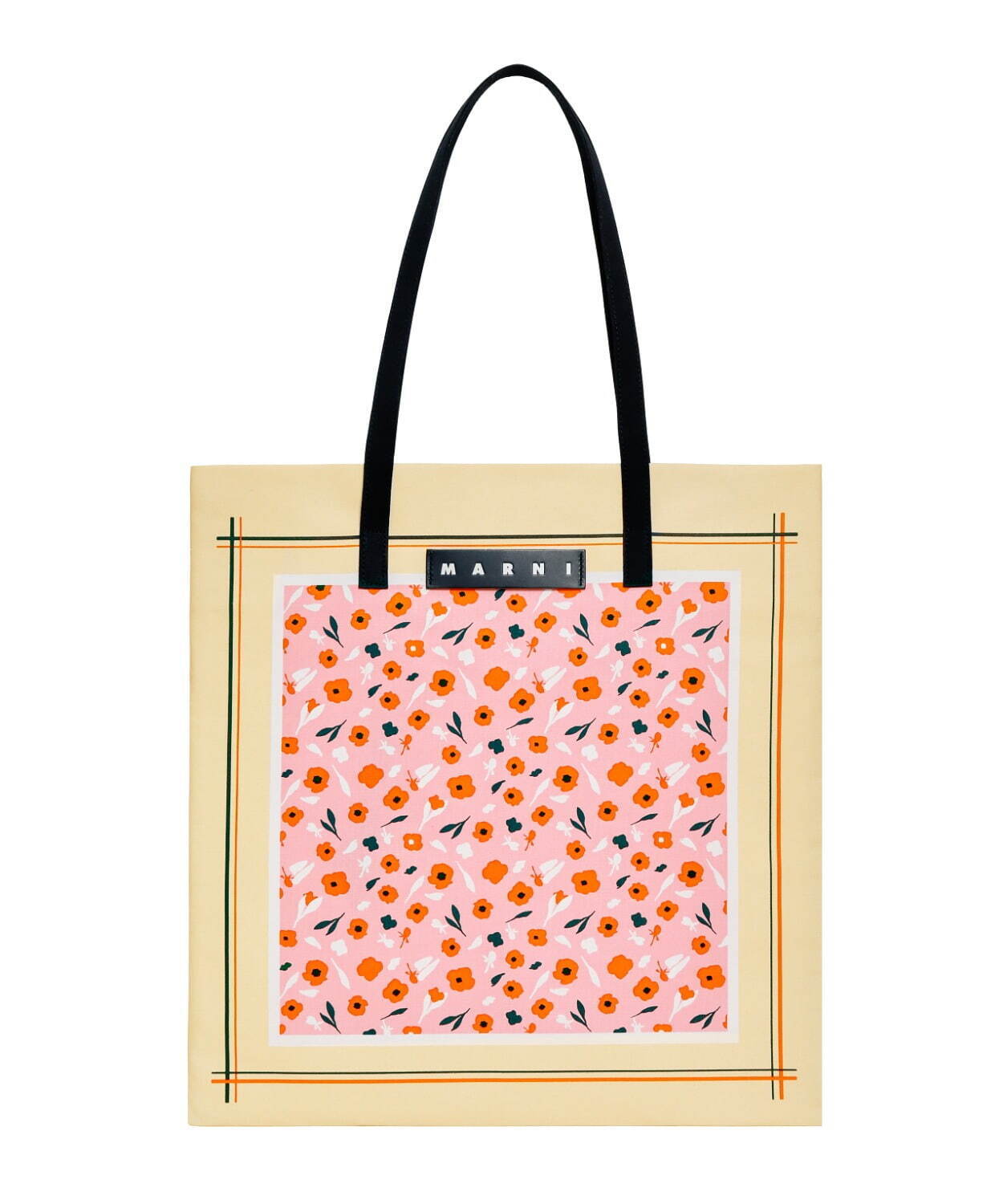 The most eye-catching tote bags are two rectangular shopping bags . One is decorated with a pixel-style cherry pattern on the bag , with red polka dots, blue stripes and a black frame, creating an artistic appeal and a sweet and cool style; the other bag is decorated with a pink background and small orange flowers , like a silk scarf pattern, exuding a fresh and soft temperament.