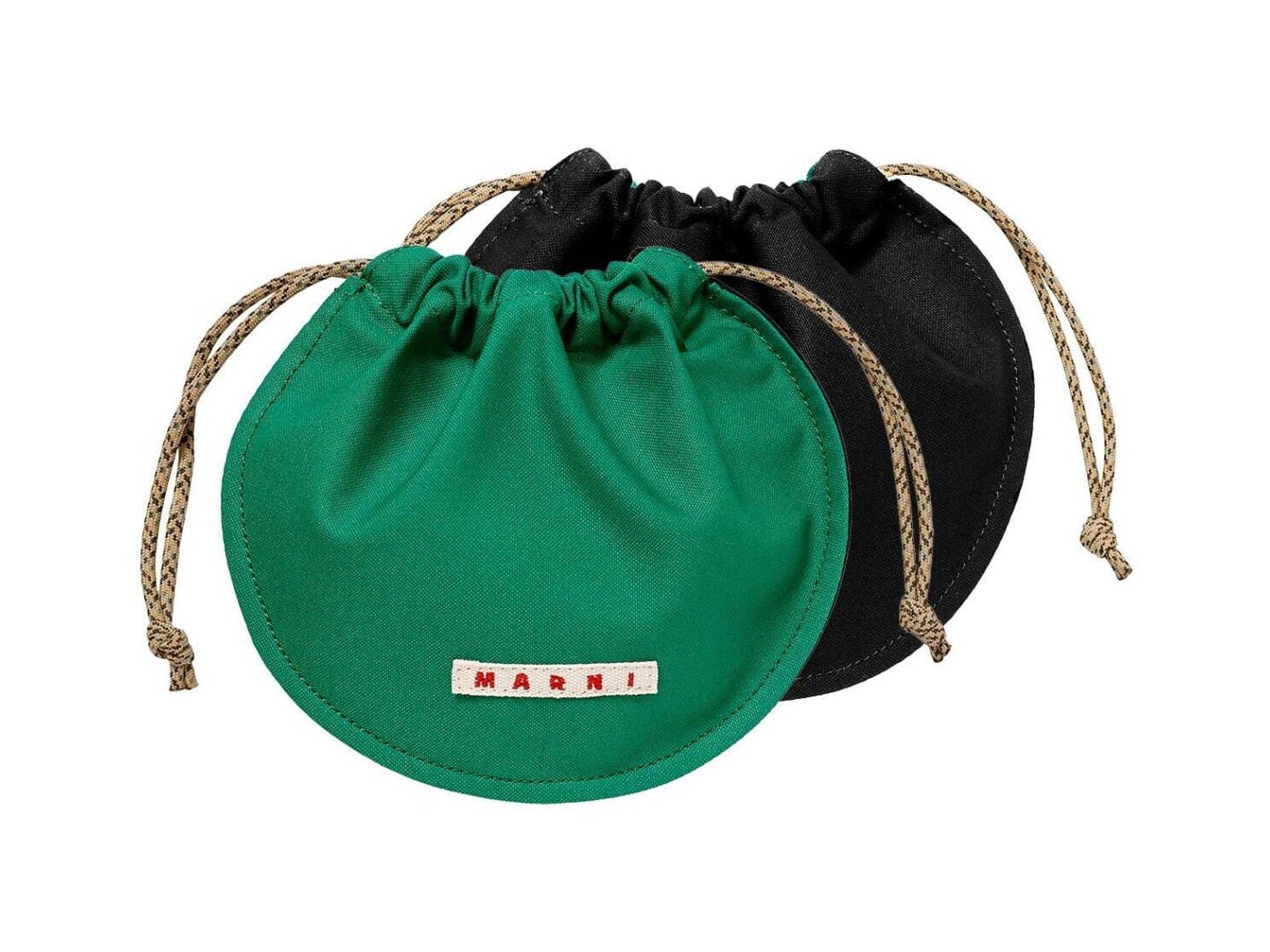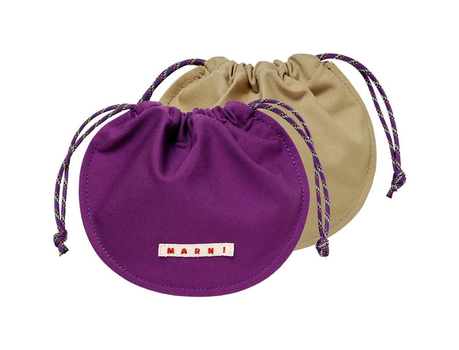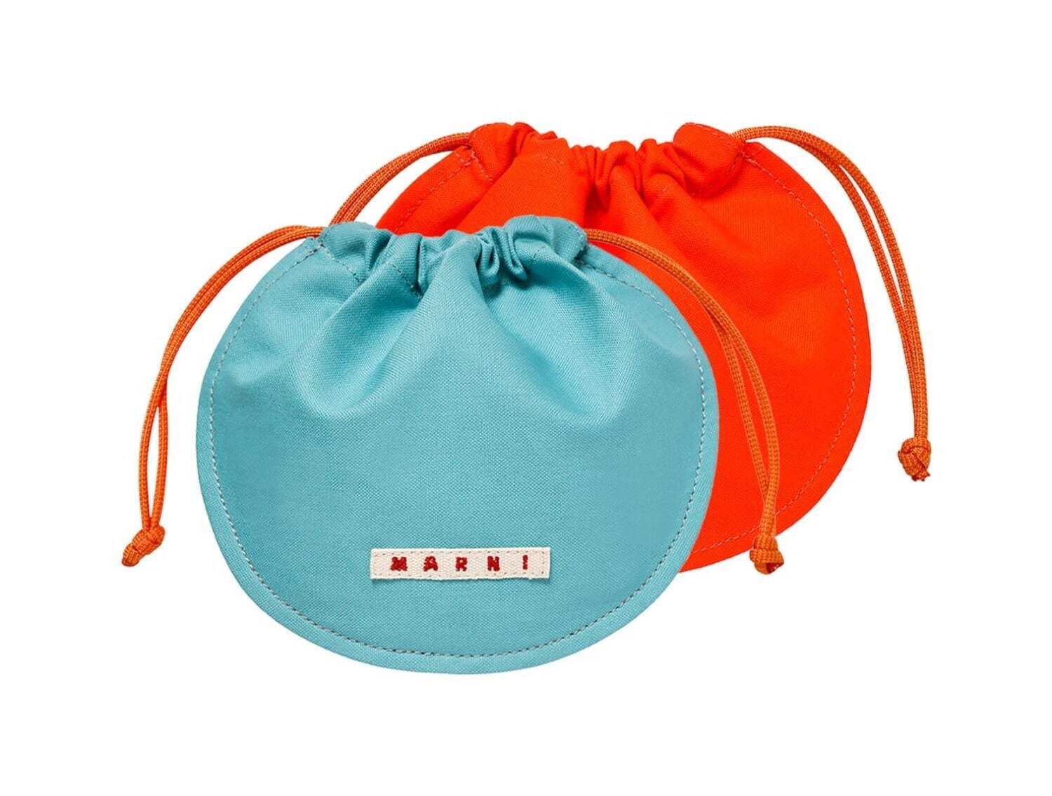 This season, Marni also introduces a set of round pouches with drawstring closures and embroidered Marni logos. Available in a variety of bright colors, they are perfect as bags within bags.