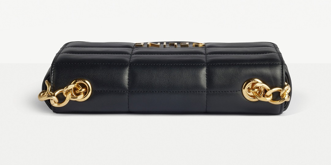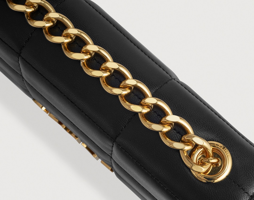 The chain goes directly through the cover and is fixed on both sides. The round hole is protected by a metal ring and engraved with the CELINE PARIS logo. The connection of the top ring buckle makes the chain rotation more flexible, and the faceted chain ring is more comfortable to carry on the body.