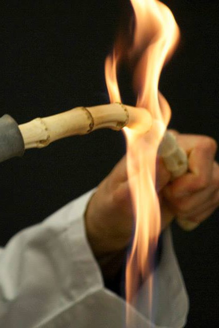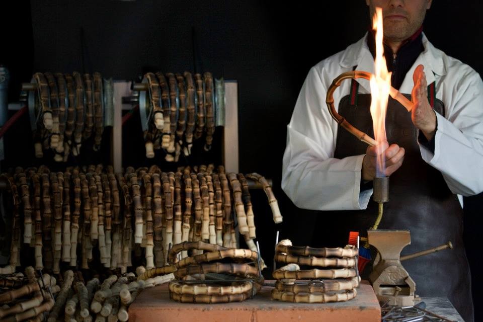 Each bamboo handle has to go through more than a dozen processes before it can be successfully produced. First, the bamboo is heated with fire to bend and shape it , then it is colored with natural beeswax and varnish, and then it is fired again to give it natural scorch marks.