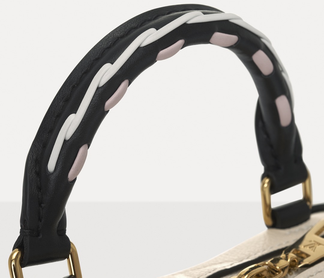 The most ingenious part is the "woven elements" added to the details , like the rustic patch stitches, which inject a natural handmade feel into the bag. The black cowhide handle is perforated, and a white and a light pink ribbon are used as stitches. Through hand-sewing, two different styles of stitches are created to create a three-dimensional undulating touch.