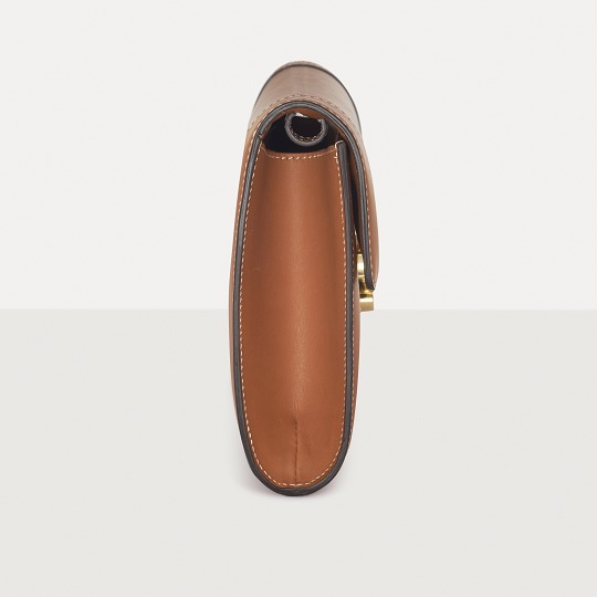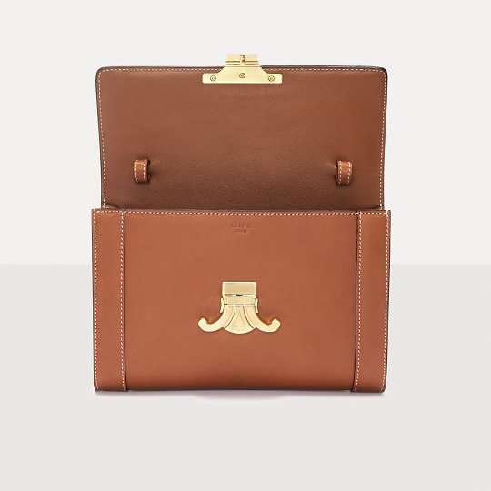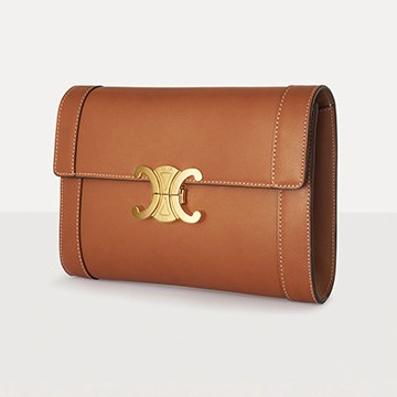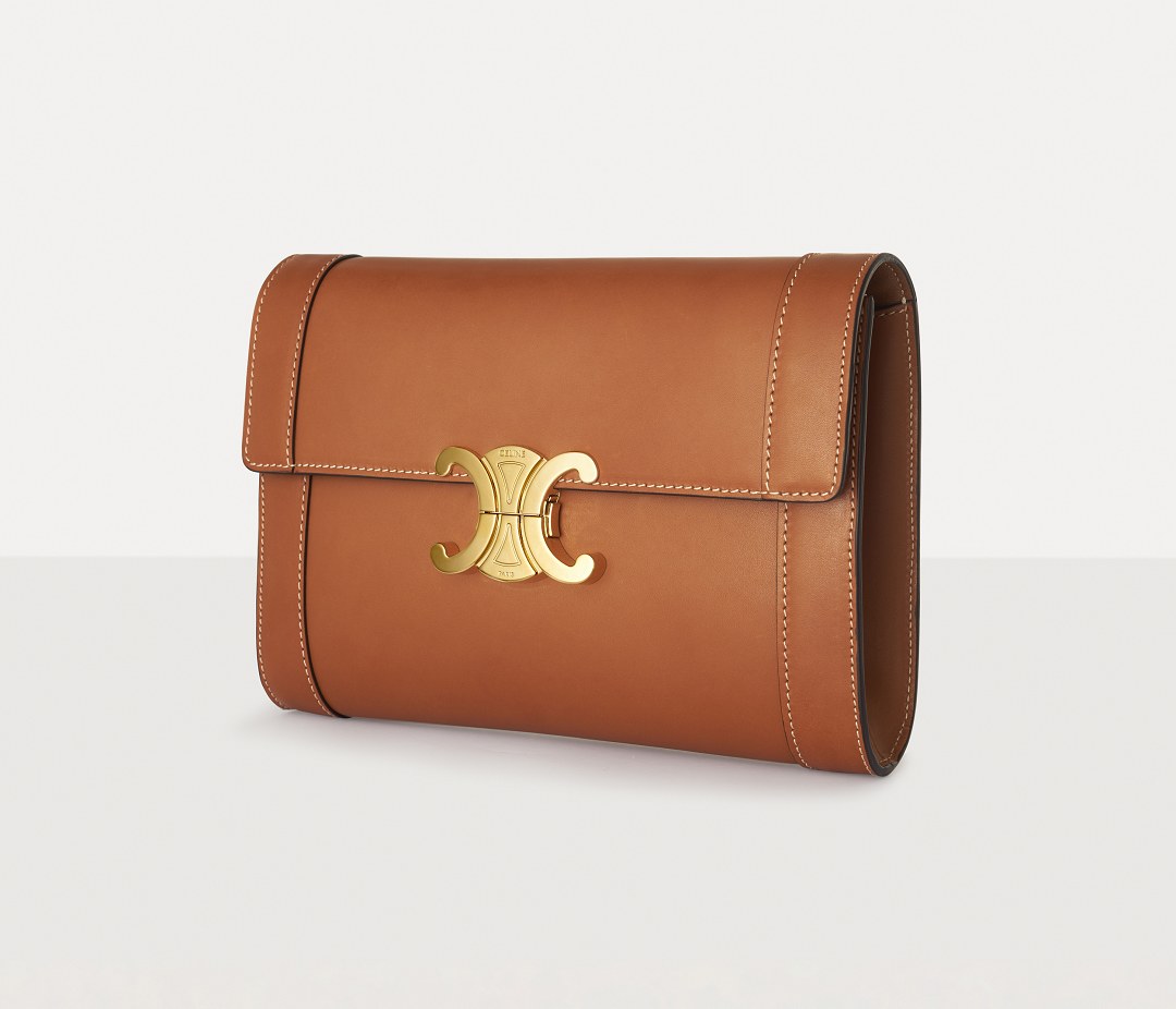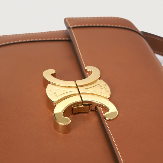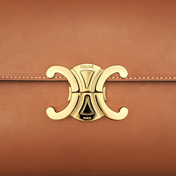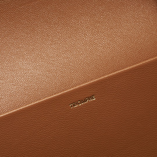 The polished and shiny Triomphe buckle is the only hardware decoration on the bag , like an embossed seal on a letter, adding a classical and solemn atmosphere to the bag. Press the spring buckles on both sides to open the bag cover, revealing a small TRIOMPHE hot stamped label on the lining.